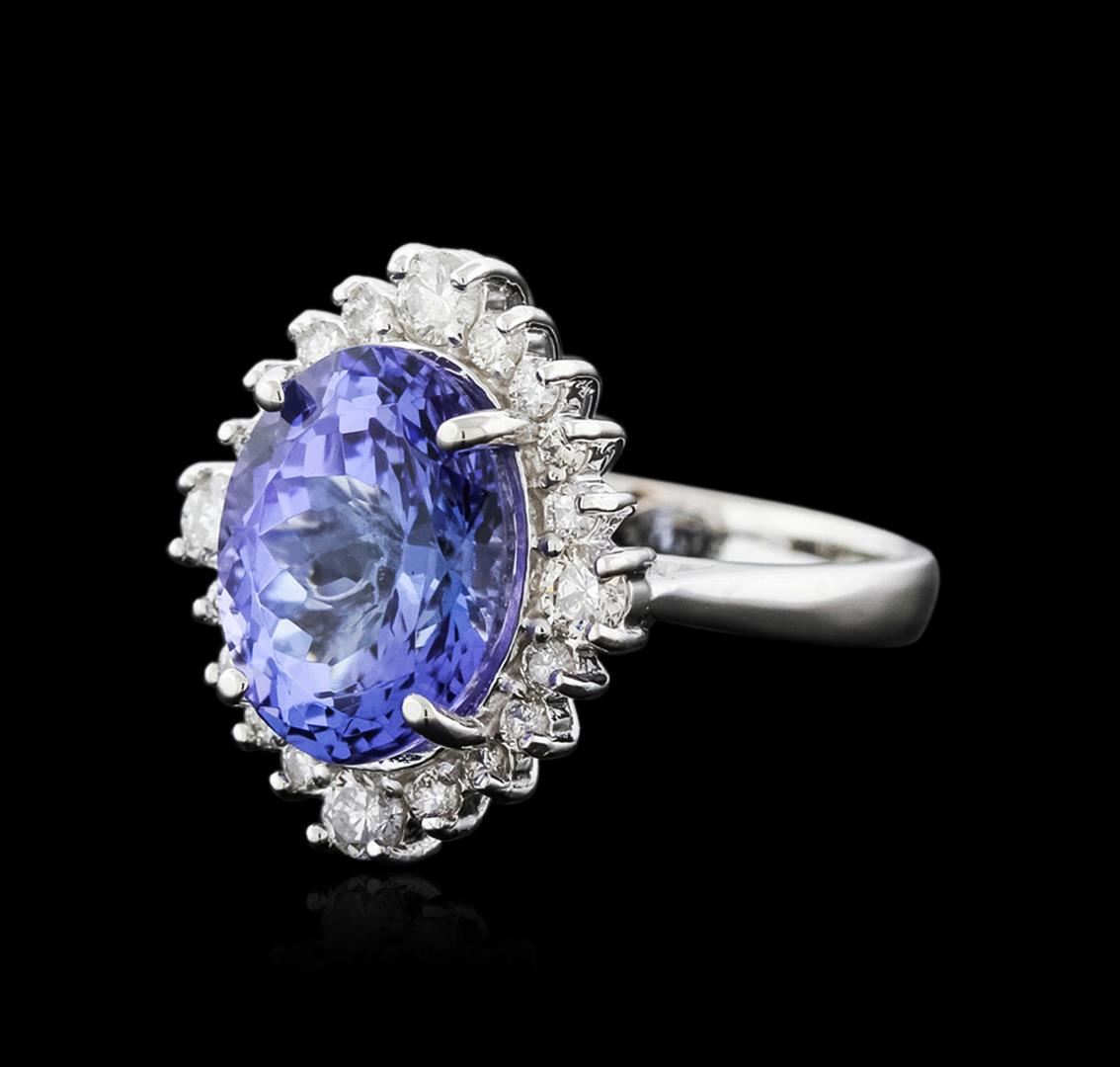 One electronically tested 14KT white gold ladies cast tanzanite and diamond ring with a bright polish finish. Identified with markings of "14K". Condition is new. Containing: One prong set oval modified brilliant cut natural tanzanite, measuring 10.49 x 9.81 x 5.07mm, approximate weight of 3.67ct., clarity is eye clean, type I, medium, very slightly grayish, violet color, (GIA V 5/3), cut is good. Four prong set round brilliant cut diamonds, measuring 2.90 - 2.90 x 1.74mm (depth est.) approximate total weight of 4 Stones = 0.36ct. Clarity: SI-1 to SI-2. Color: I - J, Cut is Good. Sixteen prong set round brilliant cut diamonds, measuring 1.70 - 1.70 x 1.02mm (depth est.) approximate total weight of 16 Stones = 0.29ct. Clarity: SI-1 to SI-2. Color: I - J, Cut is Good. Colored gemstones are presumed to have been subjected to commonly used enhancement processes. All diamonds and colored gemstones are graded in the mounting, unless otherwise stated. Total Weight of Colored Stones 3.67ct. Total Weight of Diamonds 0.64ct. Total Weight of Ring 6.50 grams. GGL Appraised at $5,615.00.