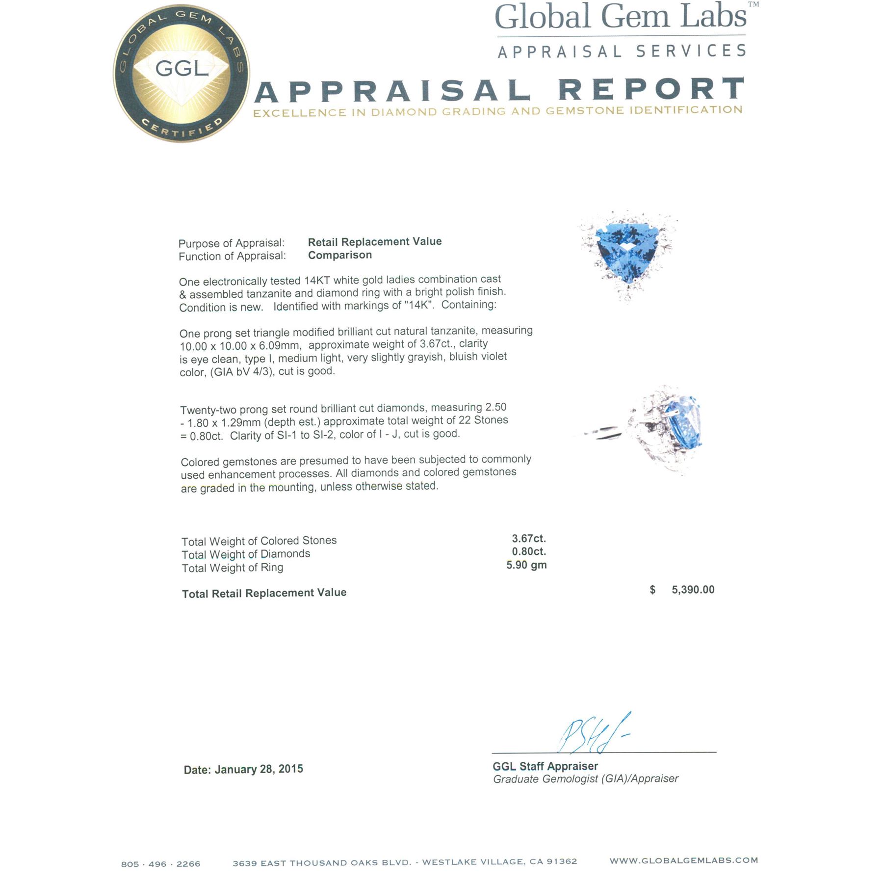 One electronically tested 14KT white gold ladies combination cast & assembled tanzanite and diamond ring with a bright polish finish. Identified with markings of "14K". Condition is new. Containing: One prong set triangle modified brilliant cut natural tanzanite, measuring 10.00 x 10.00 x 6.09mm, approximate weight of 3.67ct., clarity is eye clean, type I, medium light, very slightly grayish, bluish violet color, (GIA bV 4/3), cut is good. Twenty-Two prong set round brilliant cut diamonds, measuring 2.50 - 1.80 x 1.29mm (depth est.) approximate total weight of 22 Stones = 0.80 ct. Clarity: SI-1 to SI-2. Color: I - J, Cut is Good. Colored gemstones are presumed to have been subjected to commonly used enhancement processes. All diamonds and colored gemstones are graded in the mounting, unless otherwise stated. Total Weight of Colored Stones 3.67ct. Total Weight of Diamonds 0.80 ct. Total Weight of Ring 5.90 grams. GGL Appraised.