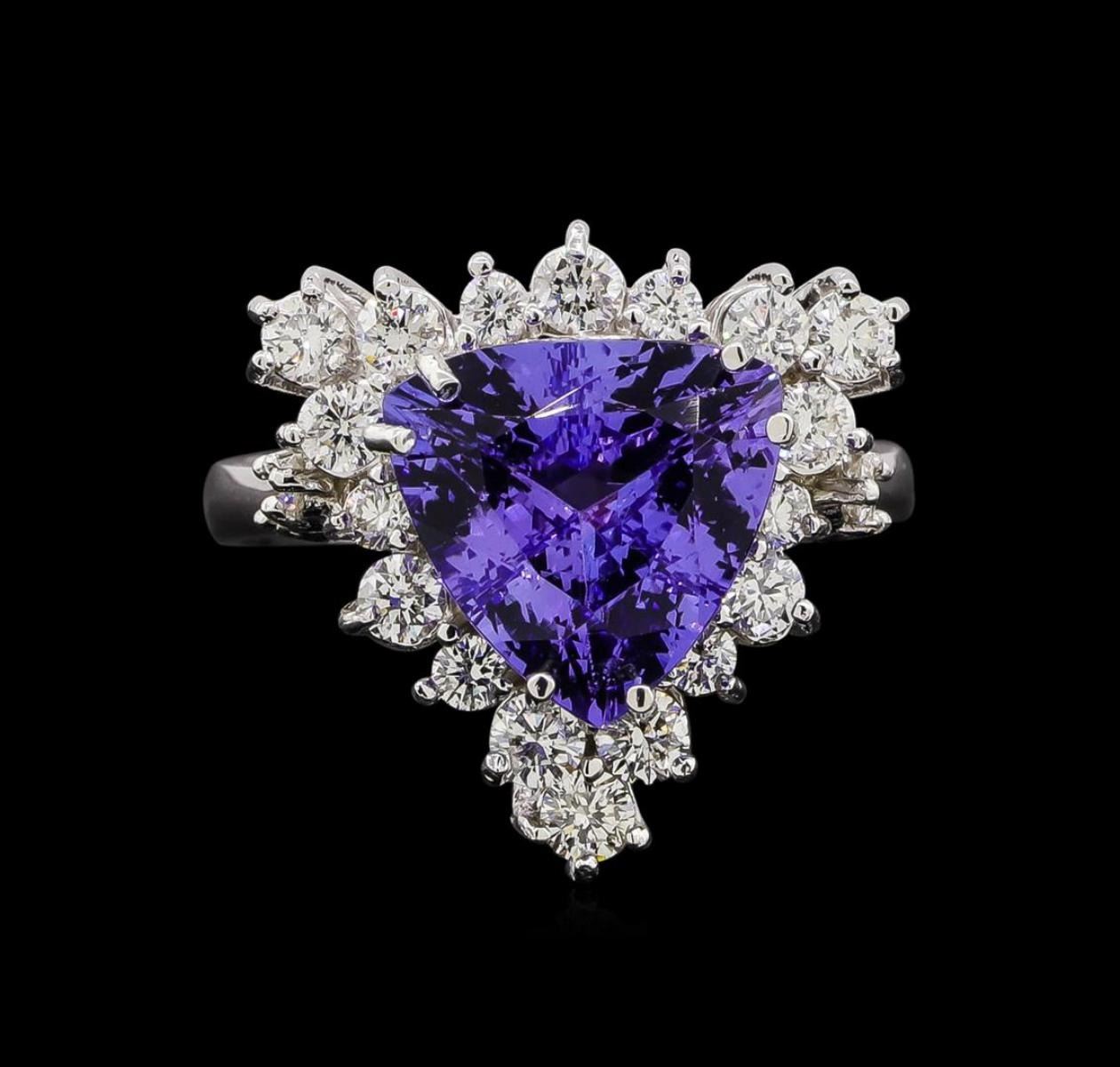 One electronically tested 14KT white gold ladies combination cast & assembled tanzanite and diamond ring with a bright polish finish. Identified with markings of "14K". Condition is new. Containing: One prong set triangle modified brilliant cut natural tanzanite, measuring 10.00 x 10.00 x 6.09mm, approximate weight of 3.67ct., clarity is eye clean, type I, medium light, very slightly grayish, bluish violet color, (GIA bV 4/3), cut is good. Twenty-Two prong set round brilliant cut diamonds, measuring 2.50 - 1.80 x 1.29mm (depth est.) approximate total weight of 22 Stones = 0.80 ct. Clarity: SI-1 to SI-2. Color: I - J, Cut is Good. Colored gemstones are presumed to have been subjected to commonly used enhancement processes. All diamonds and colored gemstones are graded in the mounting, unless otherwise stated. Total Weight of Colored Stones 3.67ct. Total Weight of Diamonds 0.80 ct. Total Weight of Ring 5.90 grams. GGL Appraised.