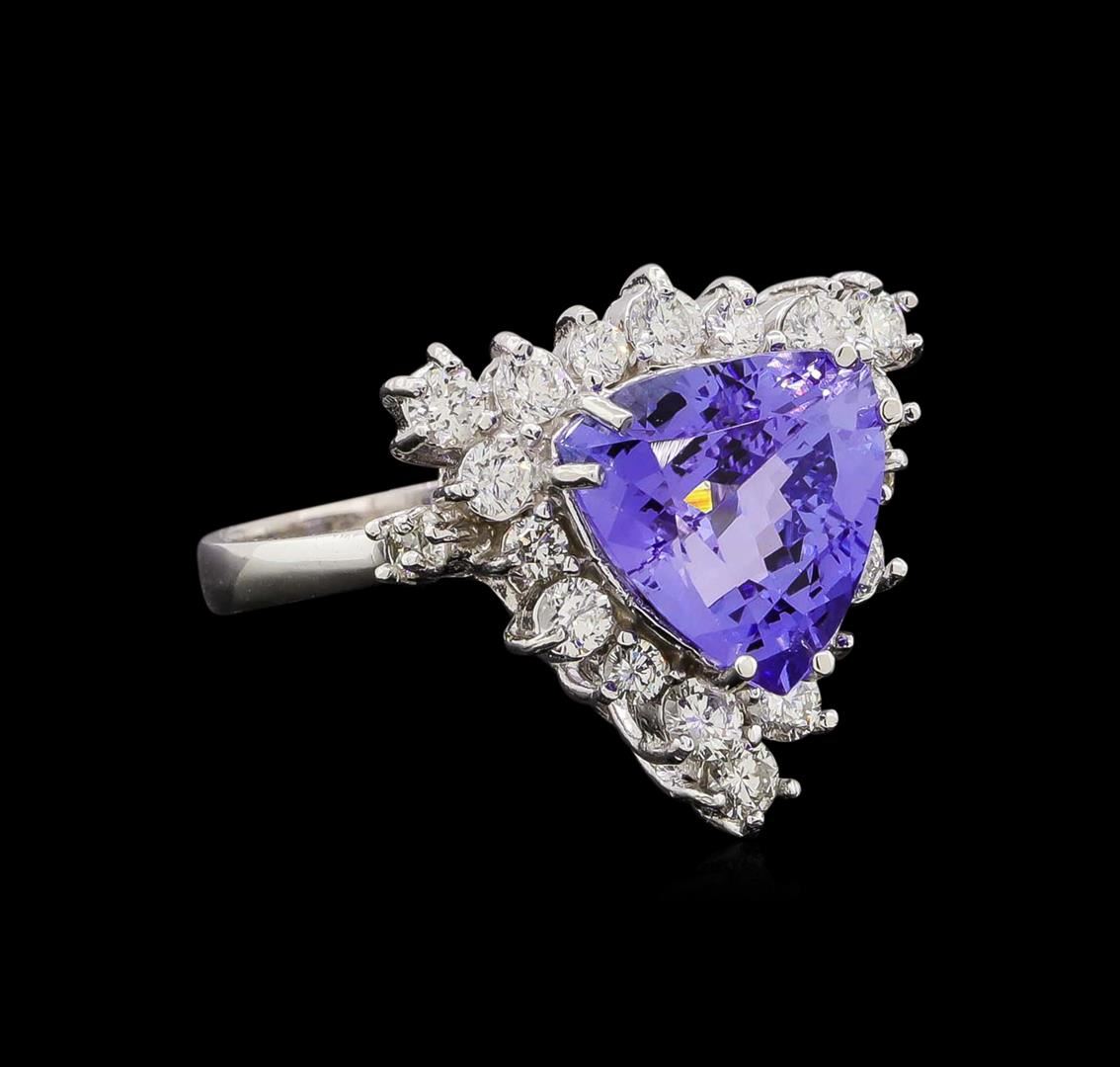 One electronically tested 14KT white gold ladies combination cast & assembled tanzanite and diamond ring with a bright polish finish. Identified with markings of "14K". Condition is new. Containing: One prong set triangle modified brilliant cut natural tanzanite, measuring 10.00 x 10.00 x 6.09mm, approximate weight of 3.67ct., clarity is eye clean, type I, medium light, very slightly grayish, bluish violet color, (GIA bV 4/3), cut is good. Twenty-Two prong set round brilliant cut diamonds, measuring 2.50 - 1.80 x 1.29mm (depth est.) approximate total weight of 22 Stones = 0.80 ct. Clarity: SI-1 to SI-2. Color: I - J, Cut is Good. Colored gemstones are presumed to have been subjected to commonly used enhancement processes. All diamonds and colored gemstones are graded in the mounting, unless otherwise stated. Total Weight of Colored Stones 3.67ct. Total Weight of Diamonds 0.80 ct. Total Weight of Ring 5.90 grams. GGL Appraised.