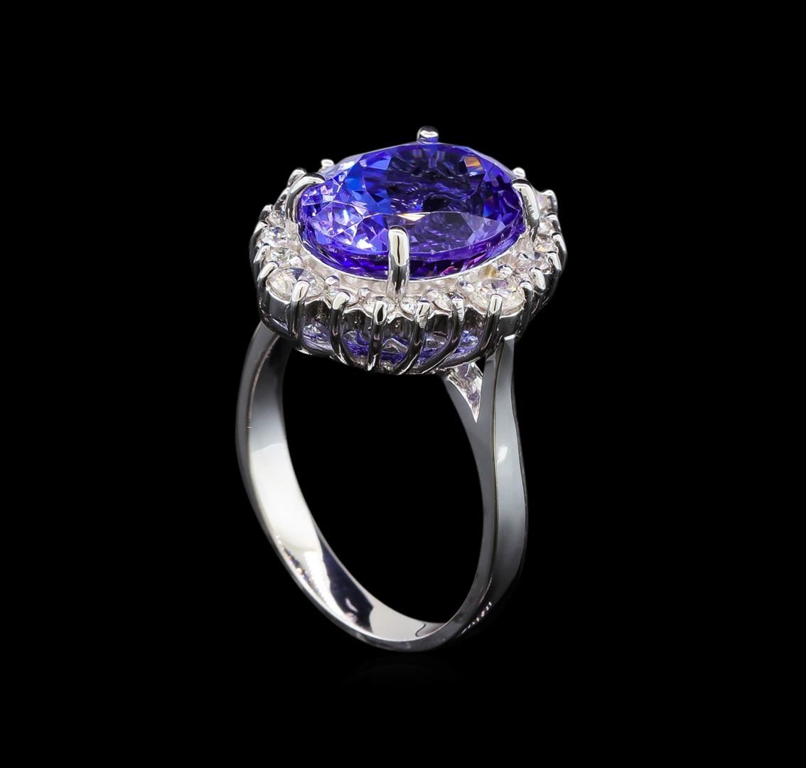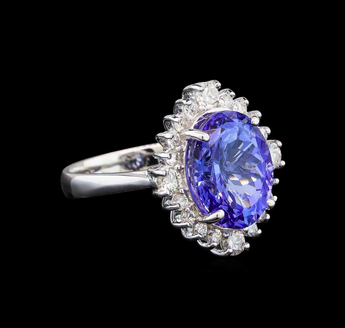 One electronically tested 14KT white gold ladies cast tanzanite and diamond ring with a bright polish finish. Identified with markings of "14K". Condition is new. Containing: One prong set oval modified brilliant cut natural tanzanite, measuring 10.49 x 9.81 x 5.07mm, approximate weight of 3.67ct., clarity is eye clean, type I, medium, very slightly grayish, violet color, (GIA V 5/3), cut is good. Four prong set round brilliant cut diamonds, measuring 2.90 - 2.90 x 1.74mm (depth est.) approximate total weight of 4 Stones = 0.36ct. Clarity: SI-1 to SI-2. Color: I - J, Cut is Good. Sixteen prong set round brilliant cut diamonds, measuring 1.70 - 1.70 x 1.02mm (depth est.) approximate total weight of 16 Stones = 0.29ct. Clarity: SI-1 to SI-2. Color: I - J, Cut is Good. Colored gemstones are presumed to have been subjected to commonly used enhancement processes. All diamonds and colored gemstones are graded in the mounting, unless otherwise stated. Total Weight of Colored Stones 3.67ct. Total Weight of Diamonds 0.64ct. Total Weight of Ring 6.50 grams. GGL Appraised.