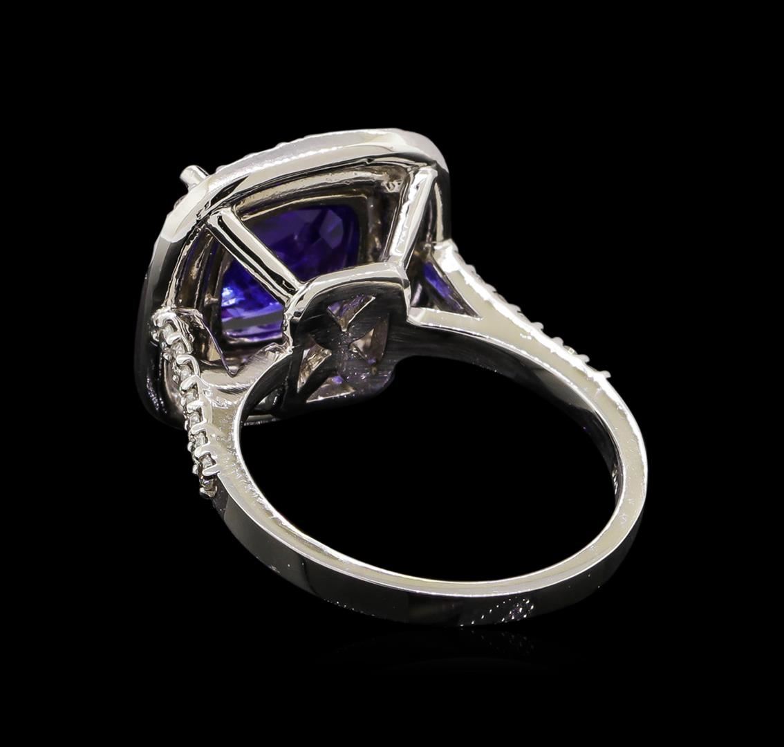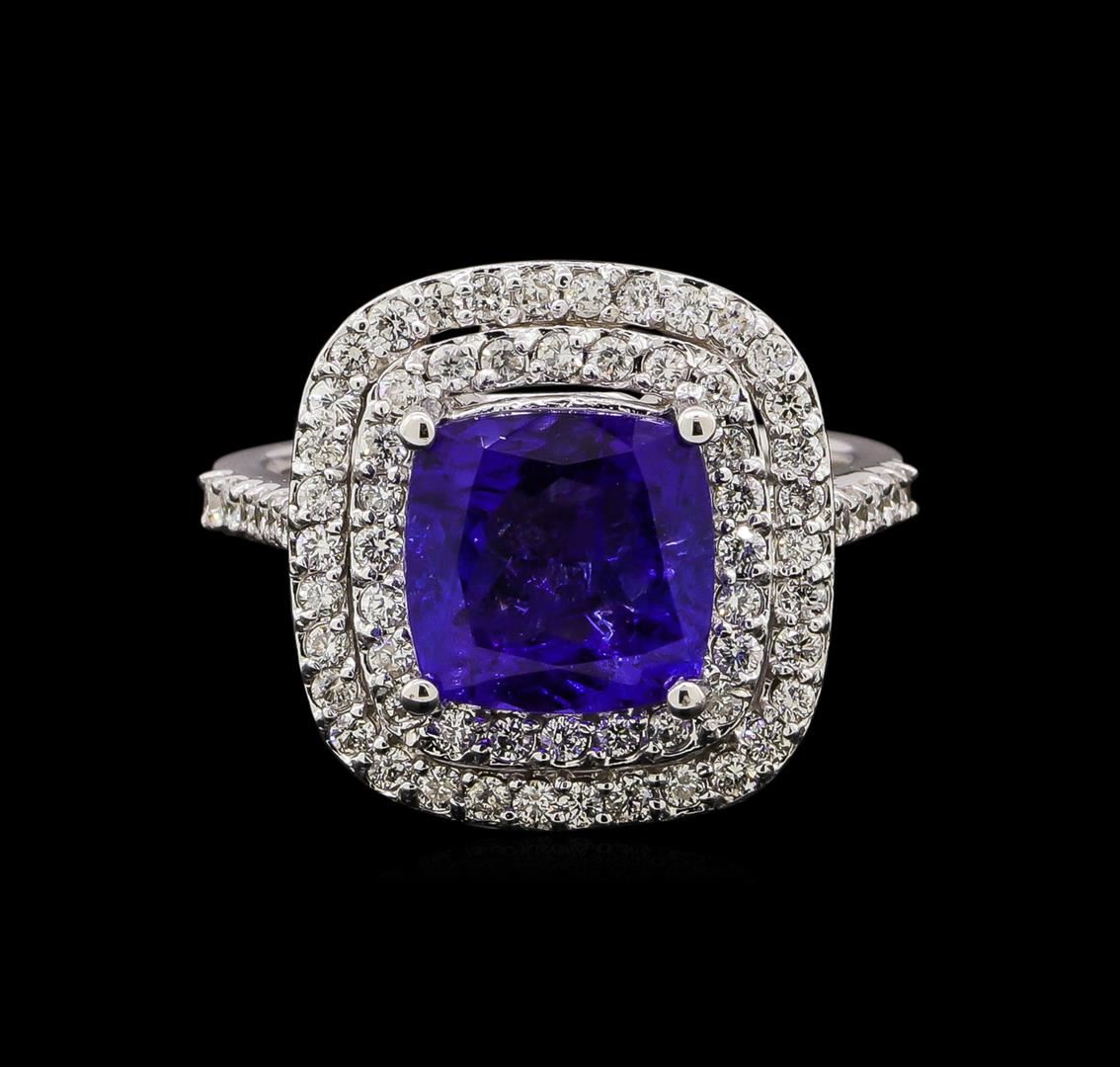 One electronically tested 14KT white gold ladies cast tanzanite and diamond ring with a bright polish finish. Identified with markings of "14K". Condition is new. Containing: One prong set square cushion modified brilliant cut natural tanzanite, measuring 9.00 x 8.90 x 5.82mm, approximate weight of 3.67ct., clarity is eye clean, type I, medium, moderately strong, bluish violet color, (GIA bV 5/4), cut is good. Sixty-Six prong set round brilliant cut diamonds, measuring 1.50 - 1.50 x 0.90mm (depth est.) approximate total weight of 66 Stones = 0.81ct. Clarity: SI-2 to I-1. Color: H - I, Cut is Good. Colored gemstones are presumed to have been subjected to commonly used enhancement processes. All diamonds and colored gemstones are graded in the mounting, unless otherwise stated. Total Weight of Colored Stones 3.67ct. Total Weight of Diamonds 0.81ct. Total Weight of Ring 6.60 grams.
