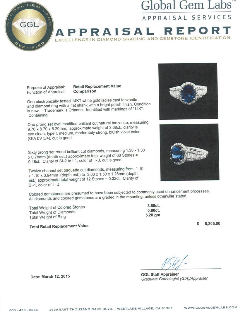 One electronically tested 14KT white gold ladies cast tanzanite and diamond ring with a flat shank with a bright polish finish. Trademark is Orianne. Identified with markings of "14K". Condition is new. Containing: One prong set oval modified brilliant cut natural tanzanite, measuring 9.70 x 8.70 x 6.20mm, approximate weight of 3.68ct., clarity is eye clean, type I, medium, moderately strong, bluish violet color, (GIA bV 5/4), cut is good. Sixty prong set round brilliant cut diamonds, measuring 1.30 - 1.30 x 0.78mm (depth est.) approximate total weight of 60 Stones = 0.48ct. Clarity: SI-2 to I-1. Color: I - J, Cut is Good. Twelve channel set baguette cut diamonds, measuring from 1.10 x 1.10 x 0.94mm (depth est.) to 3.00 x 1.50 x 1.28mm (depth est.) approximate total weight of 12 Stones = 0.32ct. Clarity: SI-1. Color: I - J. Colored gemstones are presumed to have been subjected to commonly used enhancement processes. All diamonds and colored gemstones are graded in the mounting, unless otherwise stated. Total Weight of Colored Stones 3.68ct. Total Weight of Diamonds 0.80ct. Total Weight of Ring 5.20 grams. GGL Appraised at $6,305.00.