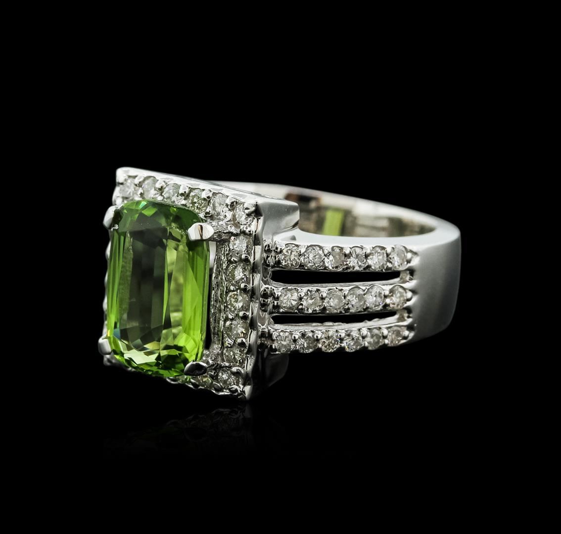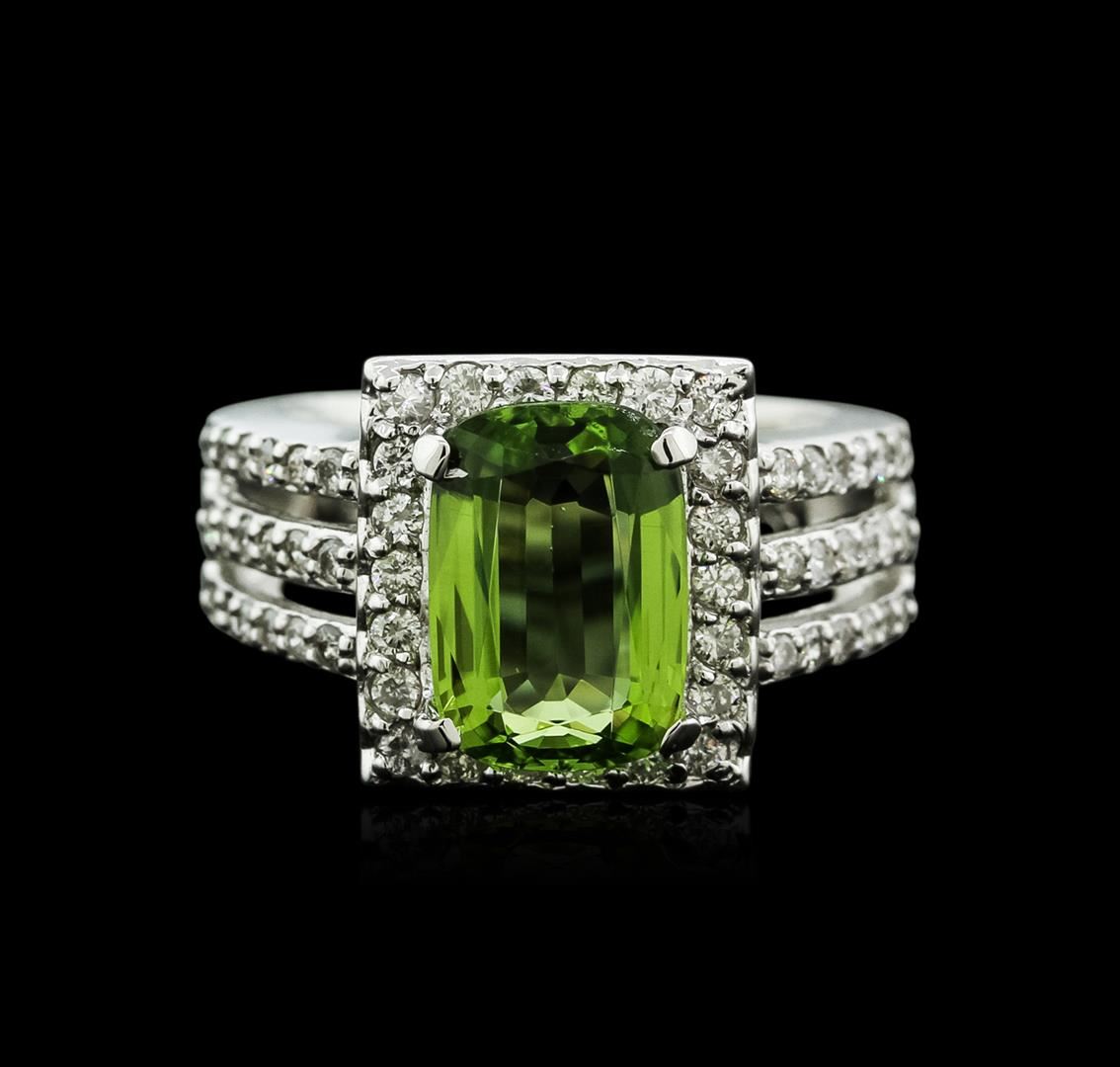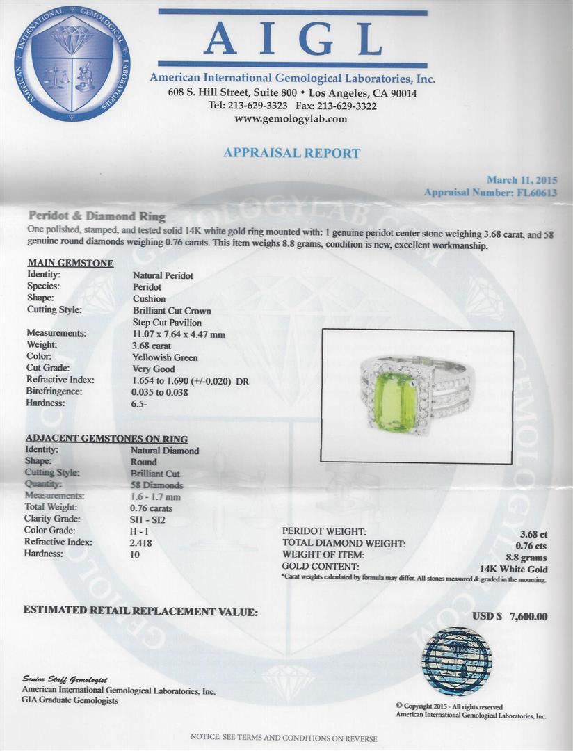 One polished, stamped, and tested solid 14K white gold ring mounted with: 1 genuine peridot center stone weighing 3.68 carat, and 58 genuine round diamonds weighing 0.76 carats. This item weighs 8.8 grams, condition, is new, excellent workmanship. MAIN GEMSTONE: Identity: Natural Peridot. Species: Peridot. Shape: Cushion. Cutting Style: Brilliant Cut Crown Step Cut Pavilion. Measurements: 11.07 x 7.64 x 4.47 mm. Weight: 3.68 carat. Color: Yellowish Green. Cut Grade: Very Good. Refractive Index: 1.654 to 1.690 (+/-0.020) DR. Birefringence: 0.035 to 0.038. Hardness: 6.5-. ADJACENT GEMSTONES ON RING: Identity: Natural Diamond. Shape: Round. Cutting Style: Brilliant Cut. Quantity: 58 Diamonds. Measurements 1.6 - 1.7 mm. Total Weight: 0.76 carats. Clarity Grade: SI1 - SI2. Color Grade: H - I. Refractive Index: 2.418. Hardness: 10. Peridot Weight: 3.68 ct. Total Diamond Weight: 0.76 cts. Weight of Item: 8.8 grams. Gold Content: 14K White Gold. AIGL Appraised at $7,600.00.