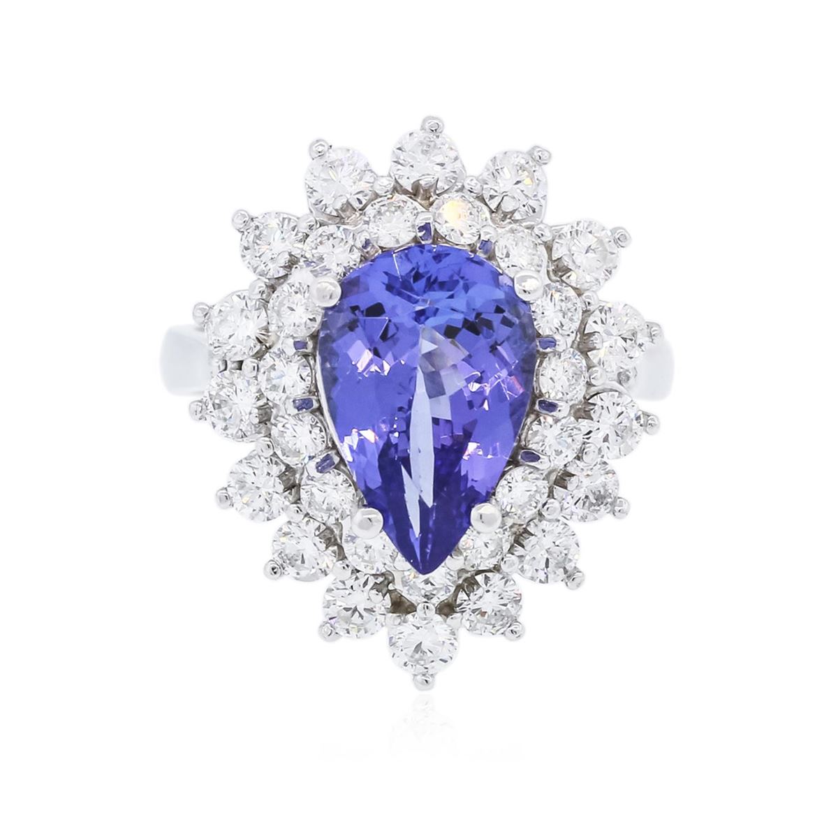 One electronically tested 14KT white gold ladies combination cast & assembled tanzanite and diamond ring with a flat shank with a bright polish finish. Identified with markings of "K14". Condition is new. Containing: One prong set pear modified brilliant cut natural tanzanite, measuring 12.30 x 8.11 x 5.52mm, approximate weight of 3.69ct., clarity is eye clean, type I, medium, moderately strong, violet color, (GIA V 5/4), cut is good. Thirty-One prong set round brilliant cut diamonds, measuring 2.50 - 2.00 x 1.35mm (depth est.) approximate total weight of 31 Stones = 1.29ct. Clarity: I-1. Color: I - J, Cut is Good. Colored gemstones are presumed to have been subjected to commonly used enhancement processes. All diamonds and colored gemstones are graded in the mounting, unless otherwise stated. Total Weight of Colored Stones 3.69ct. Total Weight of Diamonds 1.29ct. Total Weight of Ring 7.40 grams. GGL Appraised at $9,745.00.
