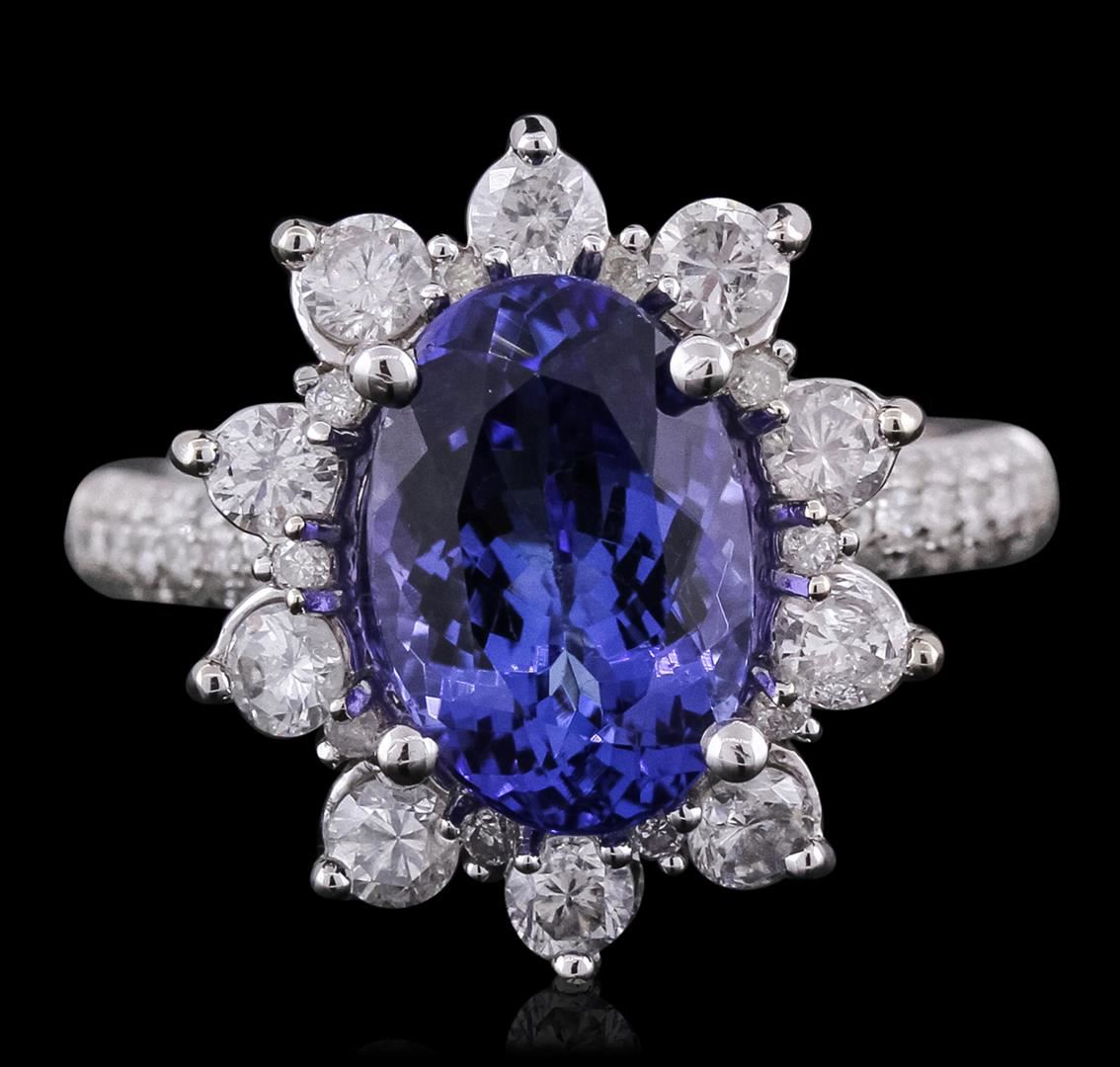 One electronically tested 14KT white gold ladies combination cast & assembled ring with a bright polish finish. Condition is new. Identified with markings of "14K". Containing: One prong set oval modified brilliant cut natural tanzanite, measuring 11.20 x 9.20 x 5.30mm, approximate weight of 3.69ct., clarity is eye clean, type I, medium, moderately strong, bluish violet color, (GIA bV 5/4), cut is good. Forty-Four prong set round brilliant cut diamonds, measuring 1.00 - 1.00 x 0.60mm (depth est.) approximate total weight of 44 Stones = 0.16ct. Clarity: I-1 to I-2. Color: H - I, Cut is Good. Ten prong set round brilliant cut diamonds, measuring 2.70 - 2.70 x 1.62mm (depth est.) approximate total weight of 10 Stones = 0.72ct. Clarity: SI-2 to I-1. Color: I - J, Cut is Good. Colored gemstones are presumed to have been subjected to commonly used enhancement processes. All diamonds and colored gemstones are graded in the mounting, unless otherwise stated. Total Weight of Colored Stones 3.69ct. Total Weight of Diamonds 0.88ct. Total Weight of Ring 5.00 grams. GGL Appraised at $9,080.00.
