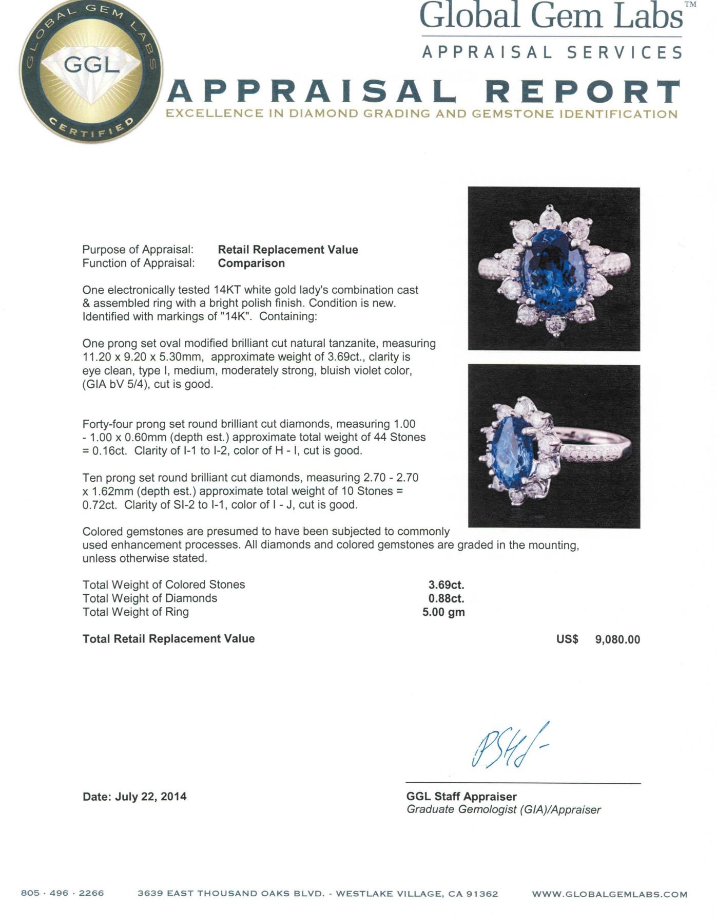 One electronically tested 14KT white gold ladies combination cast & assembled ring with a bright polish finish. Condition is new. Identified with markings of "14K". Containing: One prong set oval modified brilliant cut natural tanzanite, measuring 11.20 x 9.20 x 5.30mm, approximate weight of 3.69ct., clarity is eye clean, type I, medium, moderately strong, bluish violet color, (GIA bV 5/4), cut is good. Forty-Four prong set round brilliant cut diamonds, measuring 1.00 - 1.00 x 0.60mm (depth est.) approximate total weight of 44 Stones = 0.16ct. Clarity: I-1 to I-2. Color: H - I, Cut is Good. Ten prong set round brilliant cut diamonds, measuring 2.70 - 2.70 x 1.62mm (depth est.) approximate total weight of 10 Stones = 0.72ct. Clarity: SI-2 to I-1. Color: I - J, Cut is Good. Colored gemstones are presumed to have been subjected to commonly used enhancement processes. All diamonds and colored gemstones are graded in the mounting, unless otherwise stated. Total Weight of Colored Stones 3.69ct. Total Weight of Diamonds 0.88ct. Total Weight of Ring 5.00 grams. GGL Appraised.