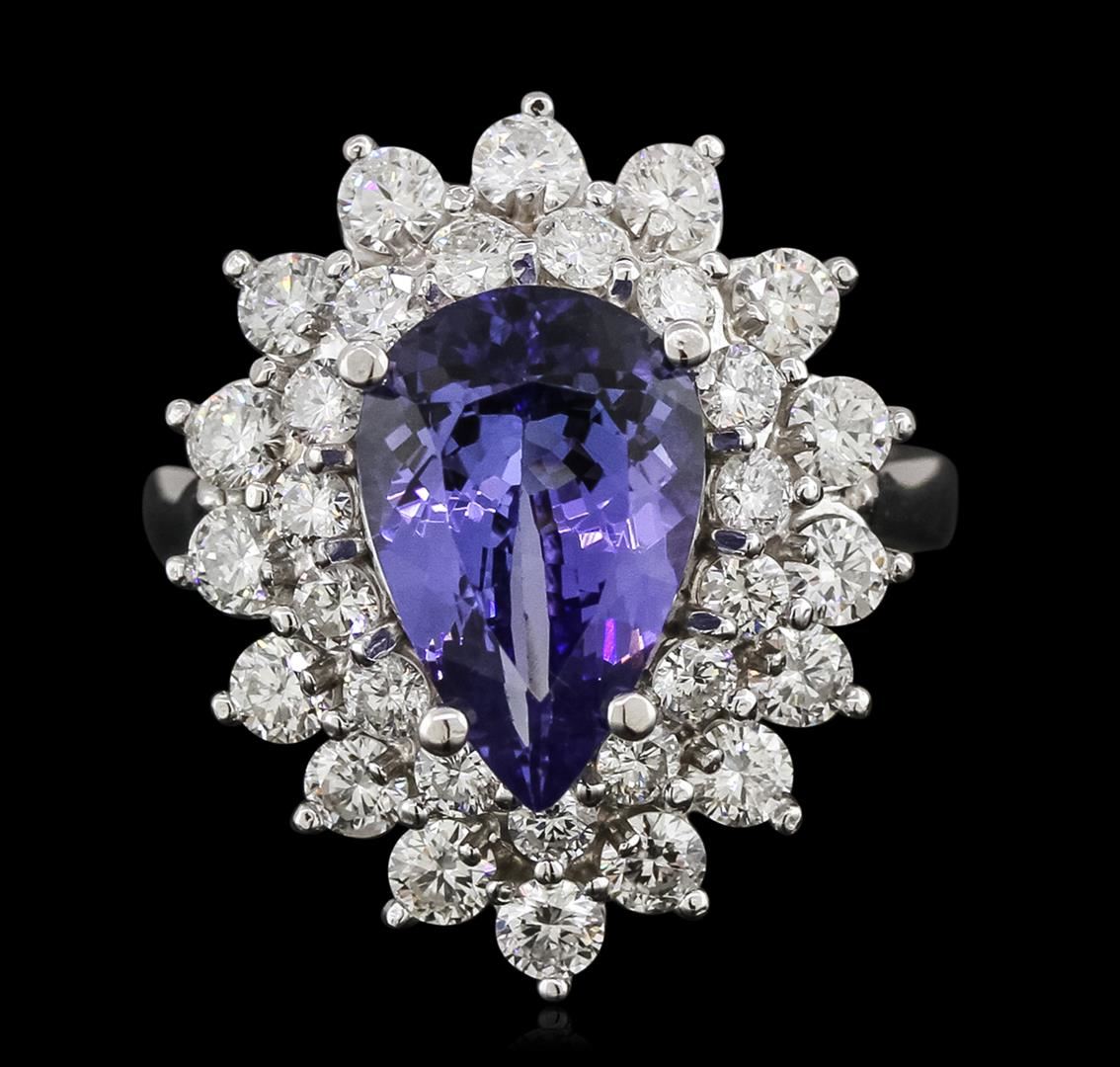 One electronically tested 14KT white gold ladies combination cast & assembled tanzanite and diamond ring with a flat shank with a bright polish finish. Identified with markings of "K14". Condition is new. Containing: One prong set pear modified brilliant cut natural tanzanite, measuring 12.30 x 8.11 x 5.52mm, approximate weight of 3.69ct., clarity is eye clean, type I, medium, moderately strong, violet color, (GIA V 5/4), cut is good. Thirty-One prong set round brilliant cut diamonds, measuring 2.50 - 2.00 x 1.35mm (depth est.) approximate total weight of 31 Stones = 1.29ct. Clarity: I-1. Color: I - J, Cut is Good. Colored gemstones are presumed to have been subjected to commonly used enhancement processes. All diamonds and colored gemstones are graded in the mounting, unless otherwise stated. Total Weight of Colored Stones 3.69ct. Total Weight of Diamonds 1.29ct. Total Weight of Ring 7.40 grams. GGL Appraised.