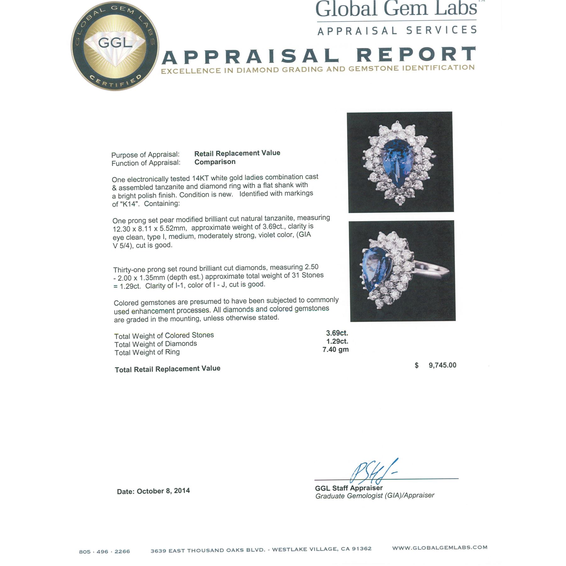 One electronically tested 14KT white gold ladies combination cast & assembled tanzanite and diamond ring with a flat shank with a bright polish finish. Identified with markings of "K14". Condition is new. Containing: One prong set pear modified brilliant cut natural tanzanite, measuring 12.30 x 8.11 x 5.52mm, approximate weight of 3.69ct., clarity is eye clean, type I, medium, moderately strong, violet color, (GIA V 5/4), cut is good. Thirty-One prong set round brilliant cut diamonds, measuring 2.50 - 2.00 x 1.35mm (depth est.) approximate total weight of 31 Stones = 1.29ct. Clarity: I-1. Color: I - J, Cut is Good. Colored gemstones are presumed to have been subjected to commonly used enhancement processes. All diamonds and colored gemstones are graded in the mounting, unless otherwise stated. Total Weight of Colored Stones 3.69ct. Total Weight of Diamonds 1.29ct. Total Weight of Ring 7.40 grams. GGL Appraised.