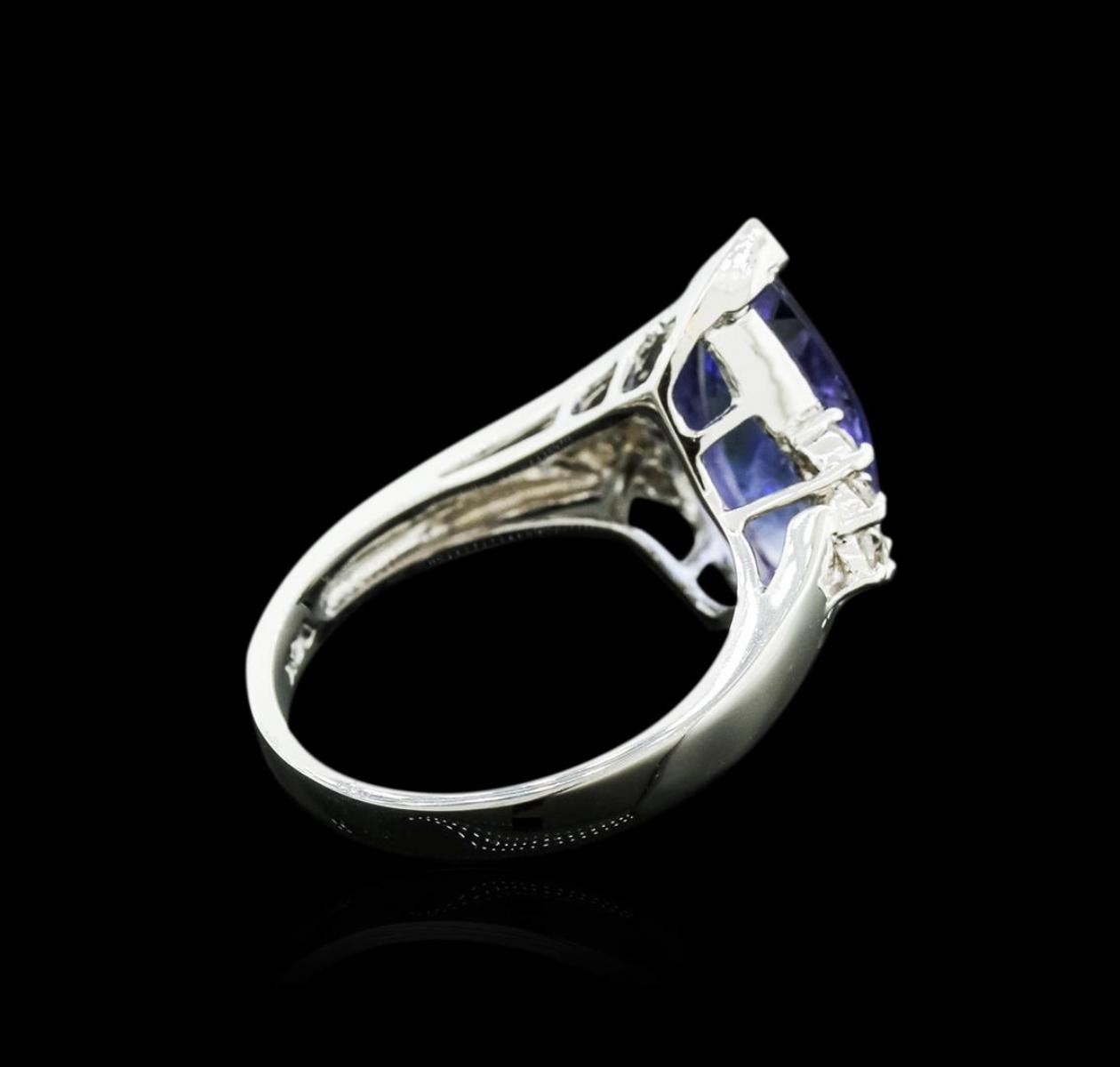 One electronically tested 14KT white gold ladies cast tanzanite and diamond ring with a bright polish finish. Identified with markings of "14K". Condition is new. Containing: One prong set marquise modified brilliant cut natural tanzanite, measuring 15.50 x 7.60 x 4.94mm, approximate weight of 3.70 ct., clarity is eye clean, type I, medium light, very slightly grayish, violet color, (GIA V 4/3), cut is good. Twelve prong set round brilliant cut diamonds, measuring 1.70 - 1.70 x 1.02mm (depth est.) approximate total weight of 12 Stones = 0.22ct.. Clarity: SI-1 to SI-2. Color: I - J, Cut is Good. Colored gemstones are presumed to have been subjected to commonly used enhancement processes. All diamonds and colored gemstones are graded in the mounting, unless otherwise stated.. Total Weight of Colored Stones 3.70 ct.. Total Weight of Diamonds 0.22ct.. Total Weight of Ring 5.20 grams. GGL Appraised.