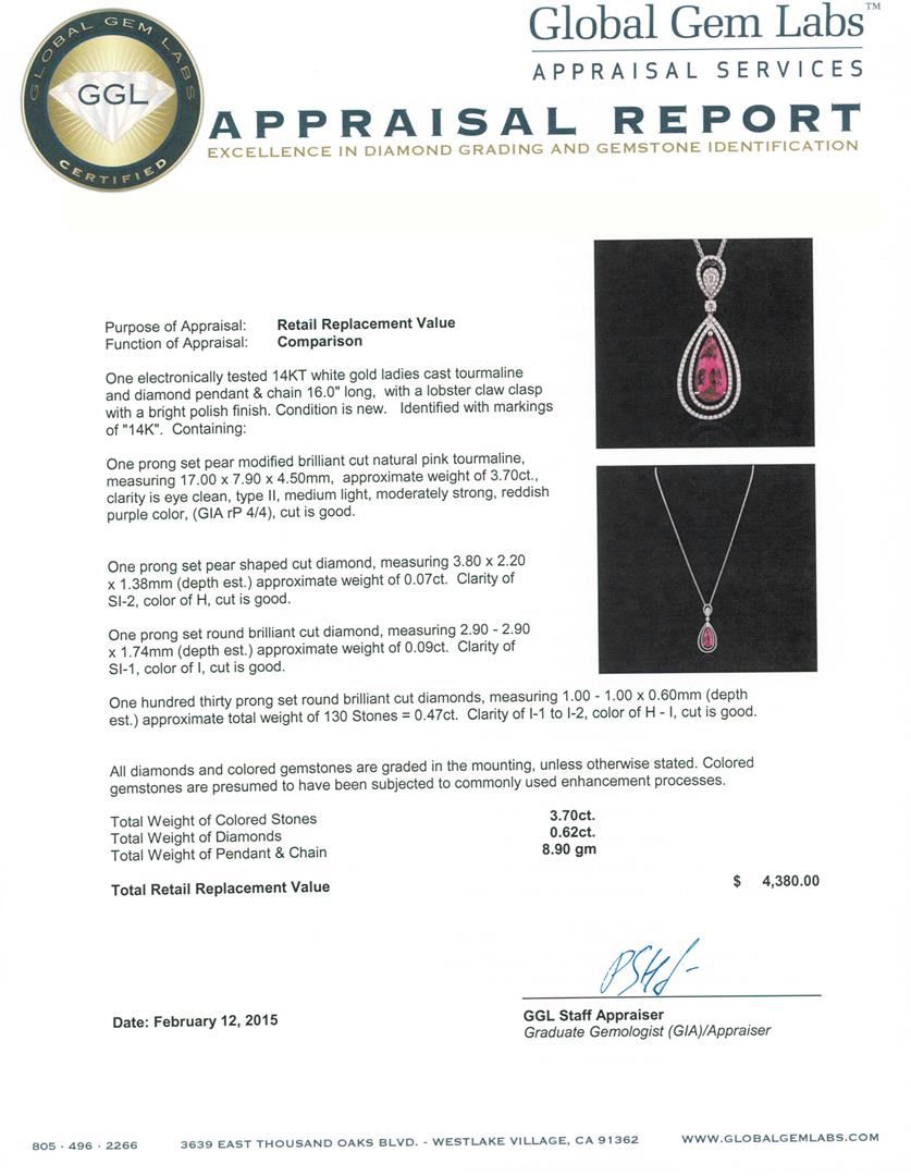 One electronically tested 14KT white gold ladies cast tourmaline and diamond pendant & chain 16.0" long, with a lobster claw clasp with a bright polish finish. Identified with markings of "14K". Condition is new. Containing: One prong set pear modified brilliant cut natural pink tourmaline, measuring 17.00 x 7.90 x 4.50mm, approximate weight of 3.70ct., clarity is eye clean, type II, medium light, moderately strong, reddish purple color, (GIA rP 4/4), cut is good. One prong set pear shaped cut diamond, measuring 3.80 x 2.20 x 1.38mm (depth est.) approximate weight of 0.07ct. Clarity: SI-2. Color: H, Cut is Good. One prong set round brilliant cut diamond, measuring 2.90 - 2.90 x 1.74mm (depth est.) approximate weight of 0.09ct. Clarity: SI-1. Color: I, Cut is Good. One Hundred Thirty prong set round brilliant cut diamonds, measuring 1.00 - 1.00 x 0.60mm (depth est.) approximate total weight of 130 Stones = 0.47ct. Clarity: I-1 to I-2. Color: H - I, Cut is Good. All diamonds and colored gemstones are graded in the mounting, unless otherwise stated. Colored gemstones are presumed to have been subjected to commonly used enhancement processes. Total Weight of Colored Stones 3.70ct. Total Weight of Diamonds 0.62ct. Total Weight of Pendant & Chain 8.90 grams. GGL Appraised at $4,380.00.