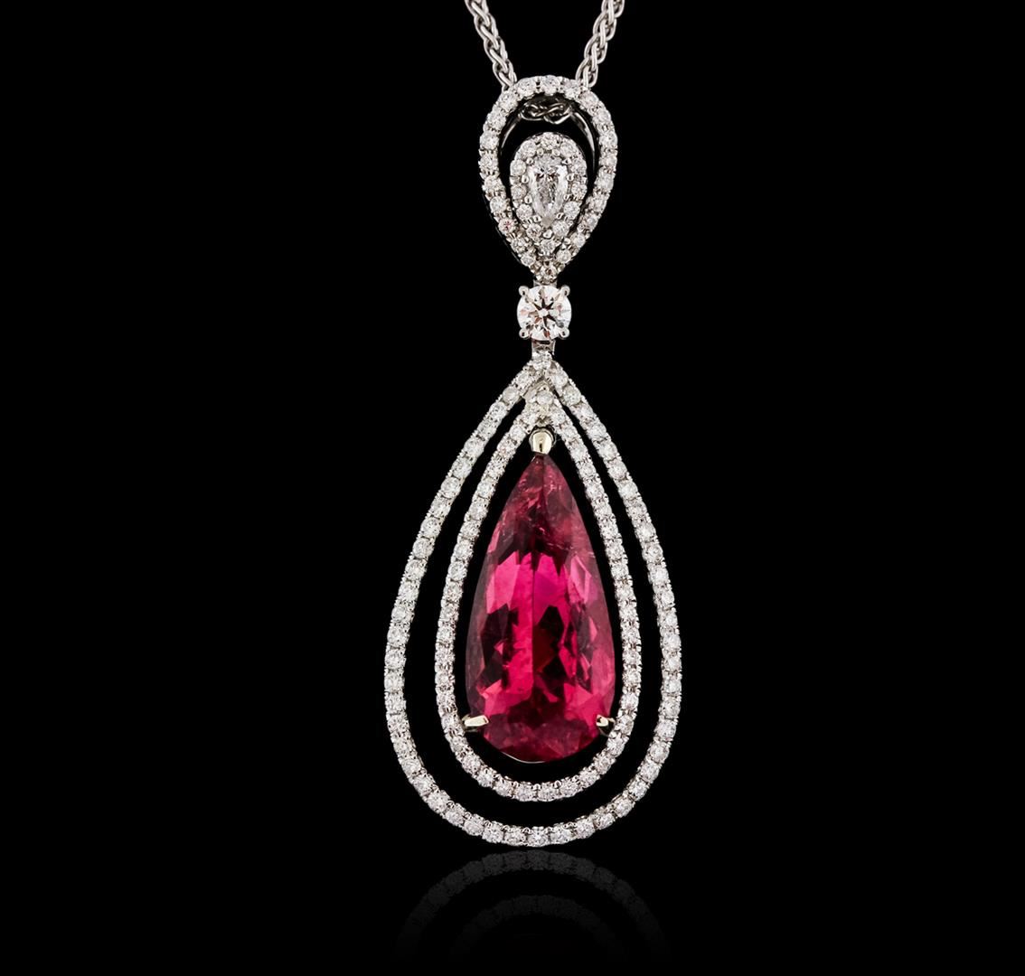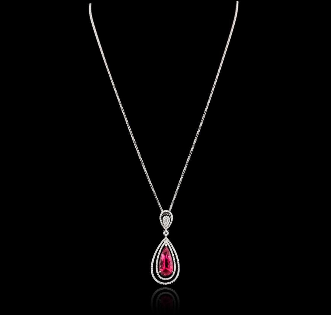 One electronically tested 14KT white gold ladies cast tourmaline and diamond pendant & chain 16.0" long, with a lobster claw clasp with a bright polish finish. Identified with markings of "14K". Condition is new. Containing: One prong set pear modified brilliant cut natural pink tourmaline, measuring 17.00 x 7.90 x 4.50mm, approximate weight of 3.70ct., clarity is eye clean, type II, medium light, moderately strong, reddish purple color, (GIA rP 4/4), cut is good. One prong set pear shaped cut diamond, measuring 3.80 x 2.20 x 1.38mm (depth est.) approximate weight of 0.07ct. Clarity: SI-2. Color: H, Cut is Good. One prong set round brilliant cut diamond, measuring 2.90 - 2.90 x 1.74mm (depth est.) approximate weight of 0.09ct. Clarity: SI-1. Color: I, Cut is Good. One Hundred Thirty prong set round brilliant cut diamonds, measuring 1.00 - 1.00 x 0.60mm (depth est.) approximate total weight of 130 Stones = 0.47ct. Clarity: I-1 to I-2. Color: H - I, Cut is Good. All diamonds and colored gemstones are graded in the mounting, unless otherwise stated. Colored gemstones are presumed to have been subjected to commonly used enhancement processes. Total Weight of Colored Stones 3.70ct. Total Weight of Diamonds 0.62ct. Total Weight of Pendant & Chain 8.90 grams. GGL Appraised at $4,380.00.