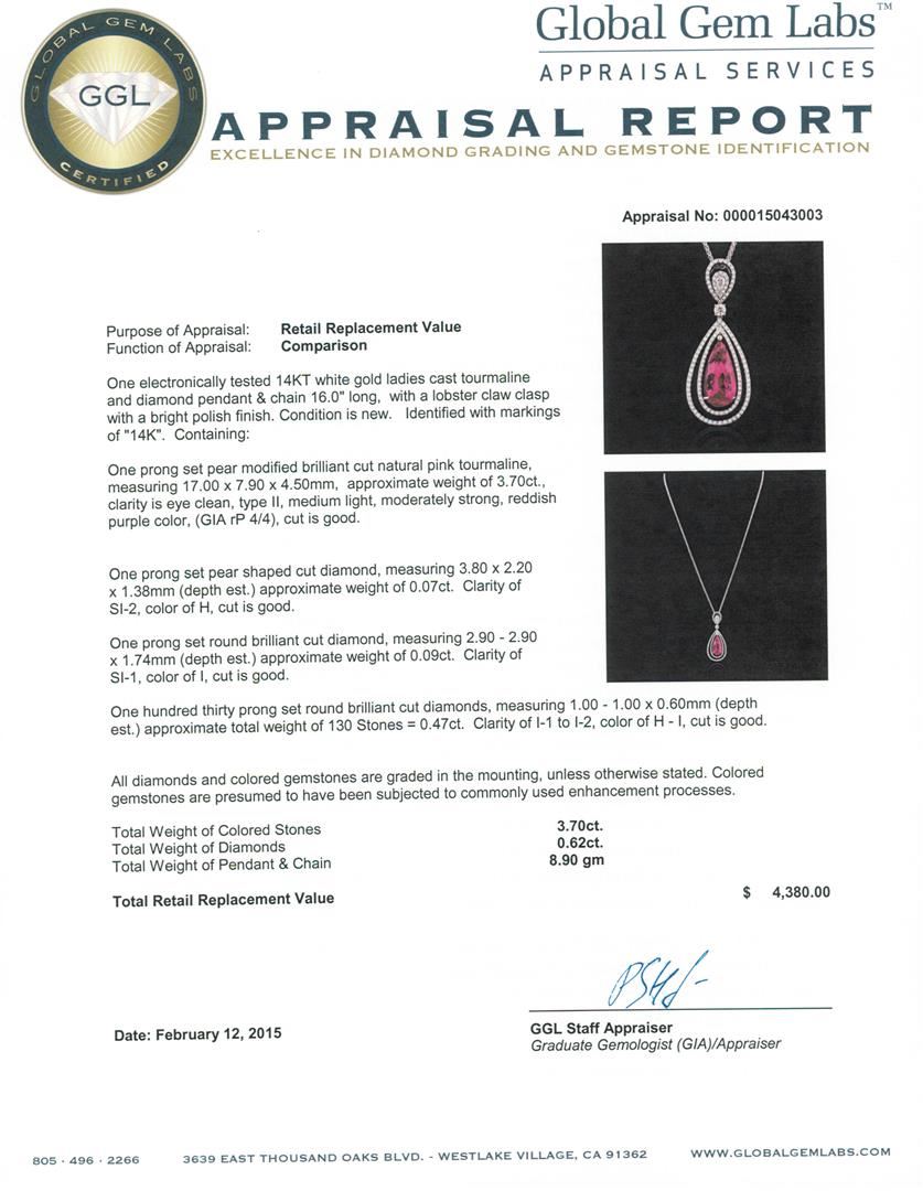 One electronically tested 14KT white gold ladies cast tourmaline and diamond pendant & chain 16.0" long, with a lobster claw clasp with a bright polish finish. Identified with markings of "14K". Condition is new. Containing: One prong set pear modified brilliant cut natural pink tourmaline, measuring 17.00 x 7.90 x 4.50mm, approximate weight of 3.70ct., clarity is eye clean, type II, medium light, moderately strong, reddish purple color, (GIA rP 4/4), cut is good. One prong set pear shaped cut diamond, measuring 3.80 x 2.20 x 1.38mm (depth est.) approximate weight of 0.07ct. Clarity: SI-2. Color: H, Cut is Good. One prong set round brilliant cut diamond, measuring 2.90 - 2.90 x 1.74mm (depth est.) approximate weight of 0.09ct. Clarity: SI-1. Color: I, Cut is Good. One Hundred Thirty prong set round brilliant cut diamonds, measuring 1.00 - 1.00 x 0.60mm (depth est.) approximate total weight of 130 Stones = 0.47ct. Clarity: I-1 to I-2. Color: H - I, Cut is Good. All diamonds and colored gemstones are graded in the mounting, unless otherwise stated. Colored gemstones are presumed to have been subjected to commonly used enhancement processes. Total Weight of Colored Stones 3.70ct. Total Weight of Diamonds 0.62ct. Total Weight of Pendant & Chain 8.90 grams. GGL Appraised at $4,380.00.
