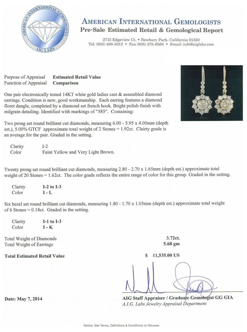 One pair electronically tested 14KT white gold ladies cast & assembled diamond earrings. Condition is new, good workmanship. Each earring features a diamond floret dangle, completed by a diamond set French hook. Bright polish finish with milgrain detailing. Identified with markings of "585". Containing: Two prong set round brilliant cut diamonds, measuring 6.00 - 5.95 x 4.00mm (depth est.), 5.00.%. GTCF approximate. Total Weight of 2 Stones = 1.92ct. Clarity grade is an average for the pair. Graded in the setting. Clarity I-2. Color: Faint Yellow and Very Light Brown. Twenty prong set round brilliant cut diamonds, measuring 2.80 - 2.70 x 1.65mm (depth est.) approximate. Total Weight of 20 Stones = 1.62ct. The color grade reflects the entire range of color for this group. Graded in the setting. Clarity: I-2 to I-3. Color: I - L Six bezel set round brilliant cut diamonds, measuring 1.80 - 1.70 x 1.05mm (depth est.) approximate. Total Weight of 6 Stones = 0.18ct. Graded in the setting. Clarity: I-1 to I-3. Color: I - K. Total Weight of Diamonds 3.72ct. Total Weight of Earrings 5.68 grams. AIG Appraised.