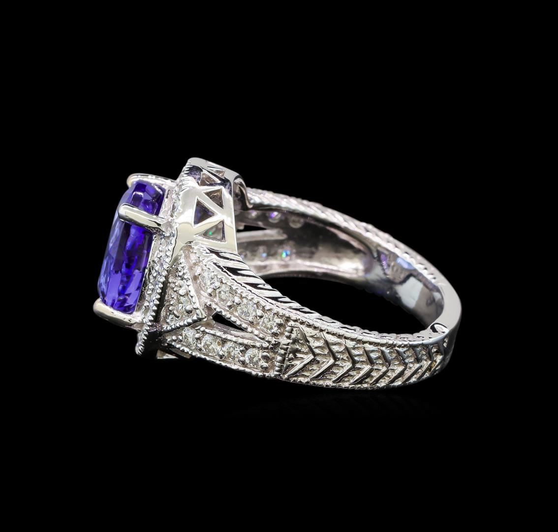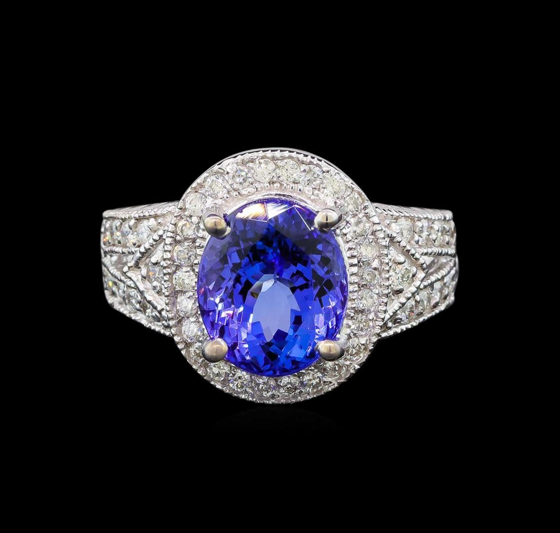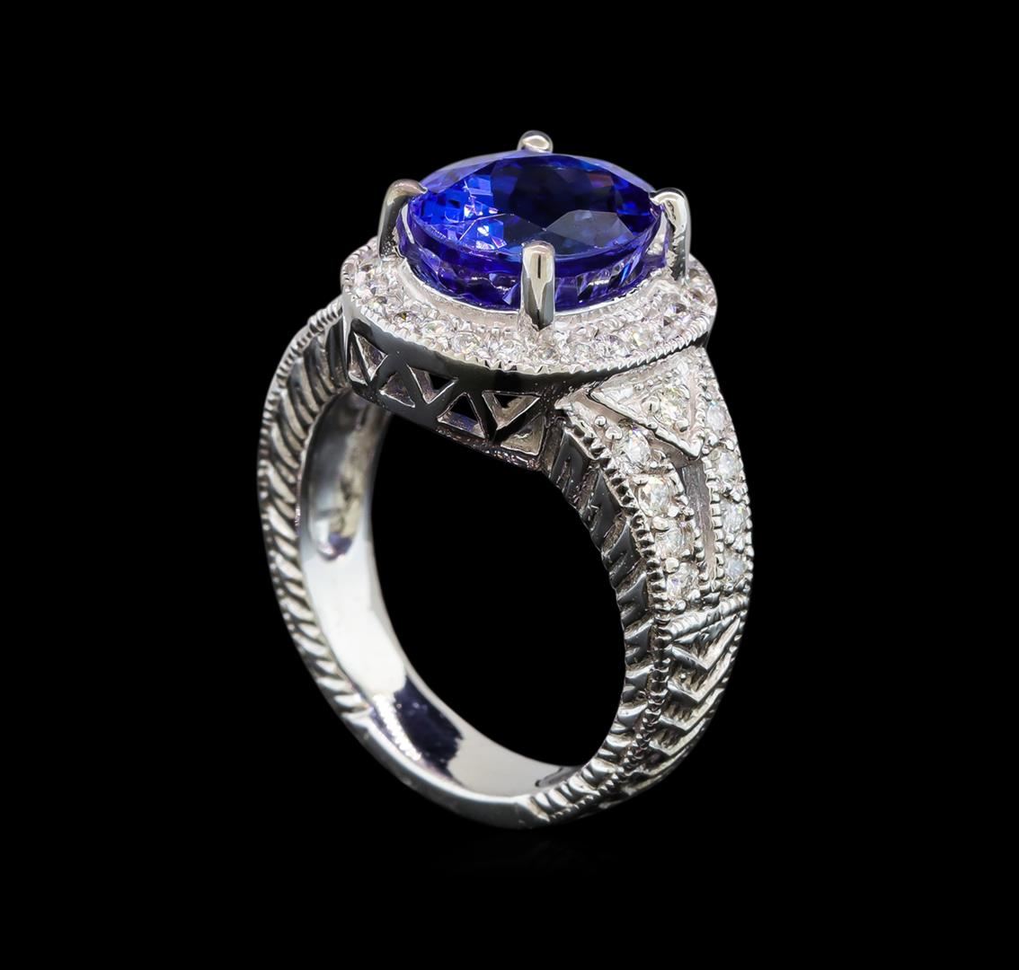 One electronically tested 14KT white gold ladies cast tanzanite and diamond ring with a bright polish finish. Condition is new. Containing: One prong set oval modified brilliant cut natural tanzanite, measuring 10.50 x 8.80 x 5.72mm, approximate weight of 3.72ct., clarity is eye clean, type I, medium light, very slightly grayish, violet color, (GIA V 4/3), cut is good. Forty-Two prong set round brilliant cut diamonds, measuring 1.50 - 1.50 x 0.90mm (depth est.) approximate total weight of 42 Stones = 0.52ct. Clarity: SI-1 to SI-2. Color: H - I, Cut is Good. Colored gemstones are presumed to have been subjected to commonly used enhancement processes. All diamonds and colored gemstones are graded in the mounting, unless otherwise stated. Total Weight of Colored Stones 3.72ct. Total Weight of Diamonds 0.52ct. Total Weight of Ring 8.30 grams. GGL Appraised at $5,820.00.