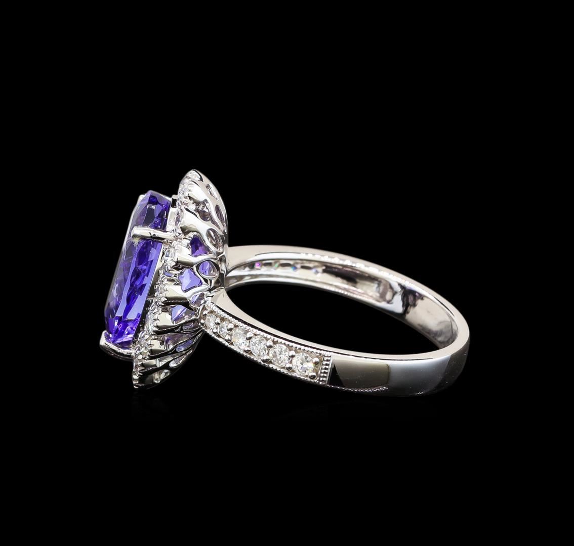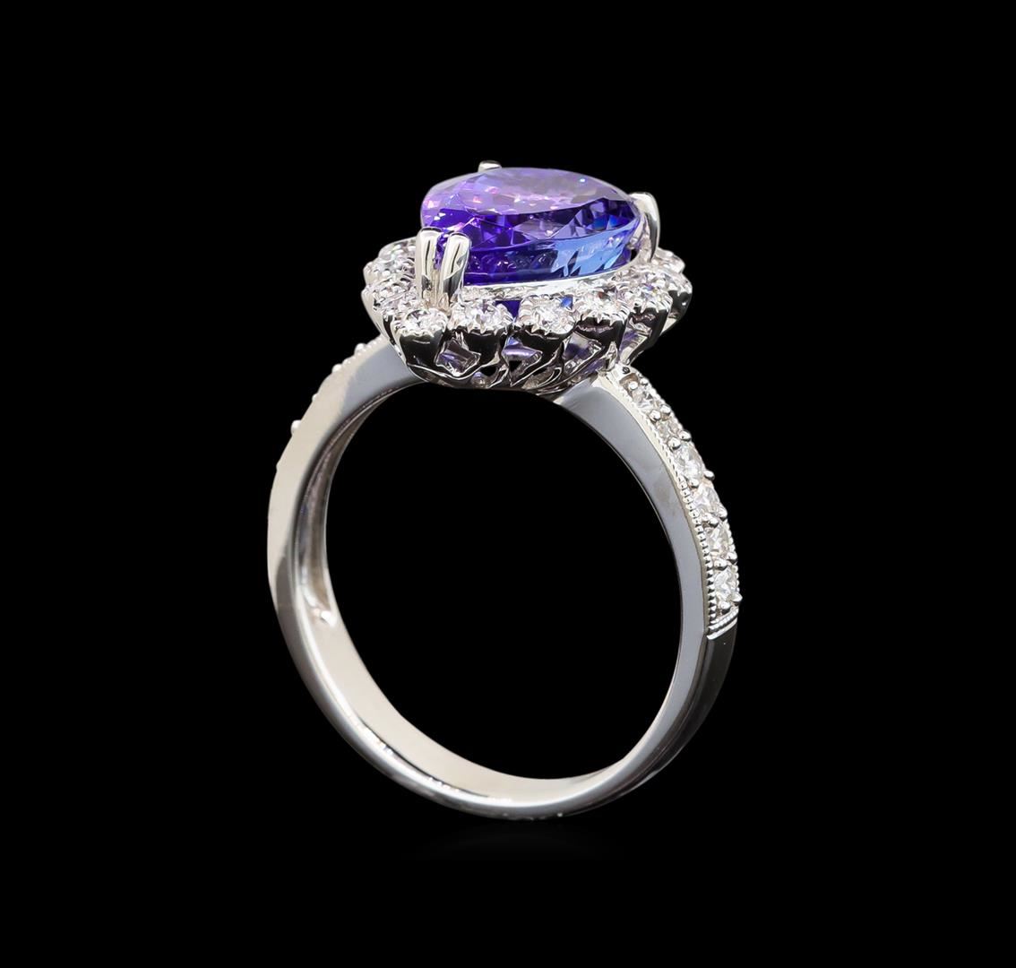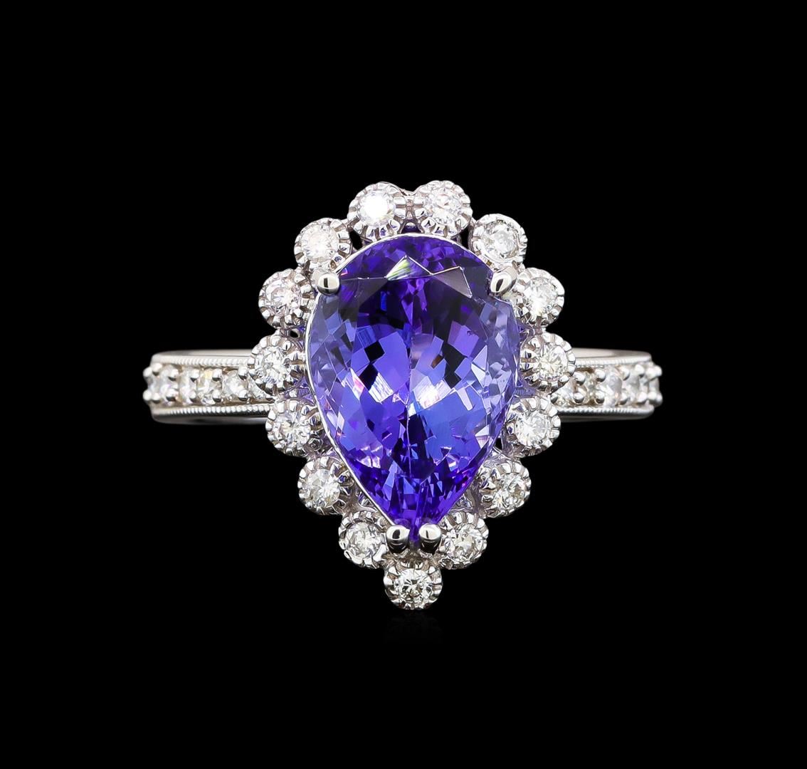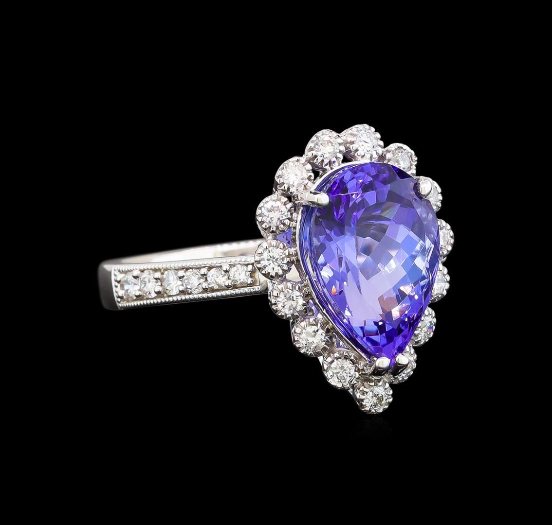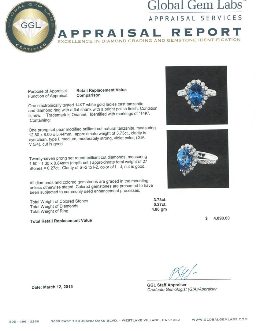 One electronically tested 14KT white gold ladies cast tanzanite and diamond ring with a flat shank with a bright polish finish. Trademark is Orianne. Identified with markings of "14K". Condition is new. Containing: One prong set pear modified brilliant cut natural tanzanite, measuring 12.80 x 8.00 x 5.44mm, approximate weight of 3.73ct., clarity is eye clean, type I, medium, moderately strong, violet color, (GIA V 5/4), cut is good. Twenty-Seven prong set round brilliant cut diamonds, measuring 1.50 - 1.30 x 0.84mm (depth est.) approximate total weight of 27 Stones = 0.27ct. Clarity: SI-2 to I-2. Color: I - J, Cut is Good. All diamonds and colored gemstones are graded in the mounting, unless otherwise stated. Colored gemstones are presumed to have been subjected to commonly used enhancement processes. Total Weight of Colored Stones 3.73ct. Total Weight of Diamonds 0.27ct. Total Weight of Ring 4.80 grams. GGL Appraised at $4,090.00.