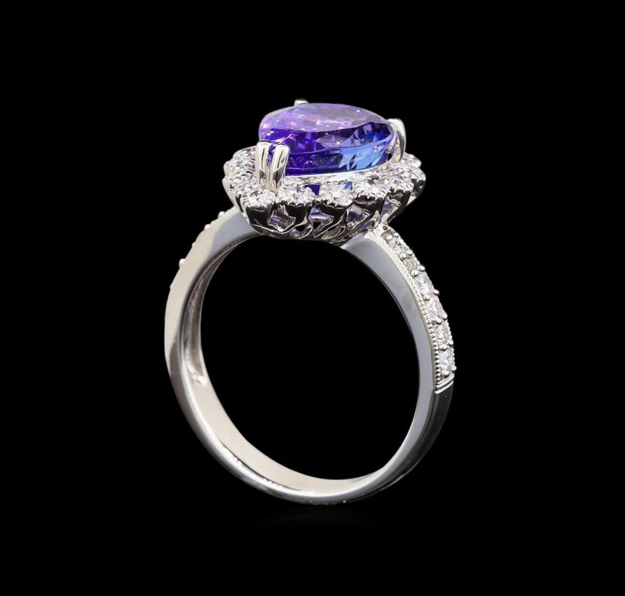 One electronically tested 14KT white gold ladies cast tanzanite and diamond ring with a flat shank with a bright polish finish. Trademark is Orianne. Identified with markings of "14K". Condition is new. Containing: One prong set pear modified brilliant cut natural tanzanite, measuring 12.80 x 8.00 x 5.44mm, approximate weight of 3.73ct., clarity is eye clean, type I, medium, moderately strong, violet color, (GIA V 5/4), cut is good. Twenty-Seven prong set round brilliant cut diamonds, measuring 1.50 - 1.30 x 0.84mm (depth est.) approximate total weight of 27 Stones = 0.27ct. Clarity: SI-2 to I-2. Color: I - J, Cut is Good. All diamonds and colored gemstones are graded in the mounting, unless otherwise stated. Colored gemstones are presumed to have been subjected to commonly used enhancement processes. Total Weight of Colored Stones 3.73ct. Total Weight of Diamonds 0.27ct. Total Weight of Ring 4.80 grams. GGL Appraised.