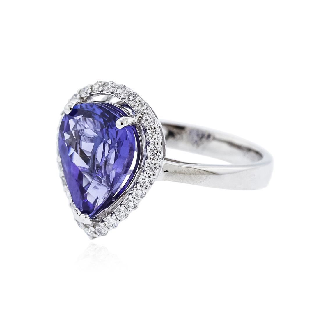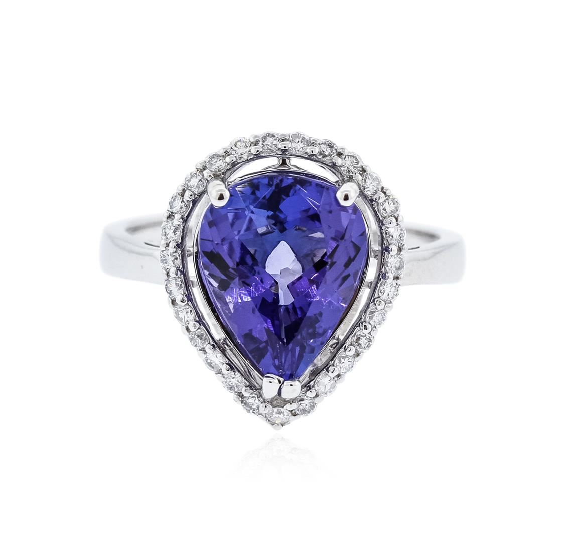 One electronically tested 14KT white gold ladies cast tanzanite and diamond ring with a half round shank with a bright polish finish. Trademark is Orianne. Identified with markings of "14K". Condition is new. Containing: One prong set pear modified brilliant cut natural tanzanite, measuring 10.99 x 9.12 x 5.60mm, approximate weight of 3.76ct., clarity is eye clean, type I, medium light, very slightly grayish, violet color, (GIA V 4/3), cut is good. Twelve prong set round brilliant cut diamonds, measuring 1.30 - 1.30 x 0.78mm (depth est.) approximate total weight of 12 Stones = 0.10ct. Clarity: SI-1 to SI-2. Color: I - J. All diamonds and colored gemstones are graded in the mounting, unless otherwise stated. Colored gemstones are presumed to have been subjected to commonly used enhancement processes. Total Weight of Colored Stones 3.76ct. Total Weight of Diamonds 0.10ct. Total Weight of Ring 3.70 grams. GGL Appraised at $3,490.00.