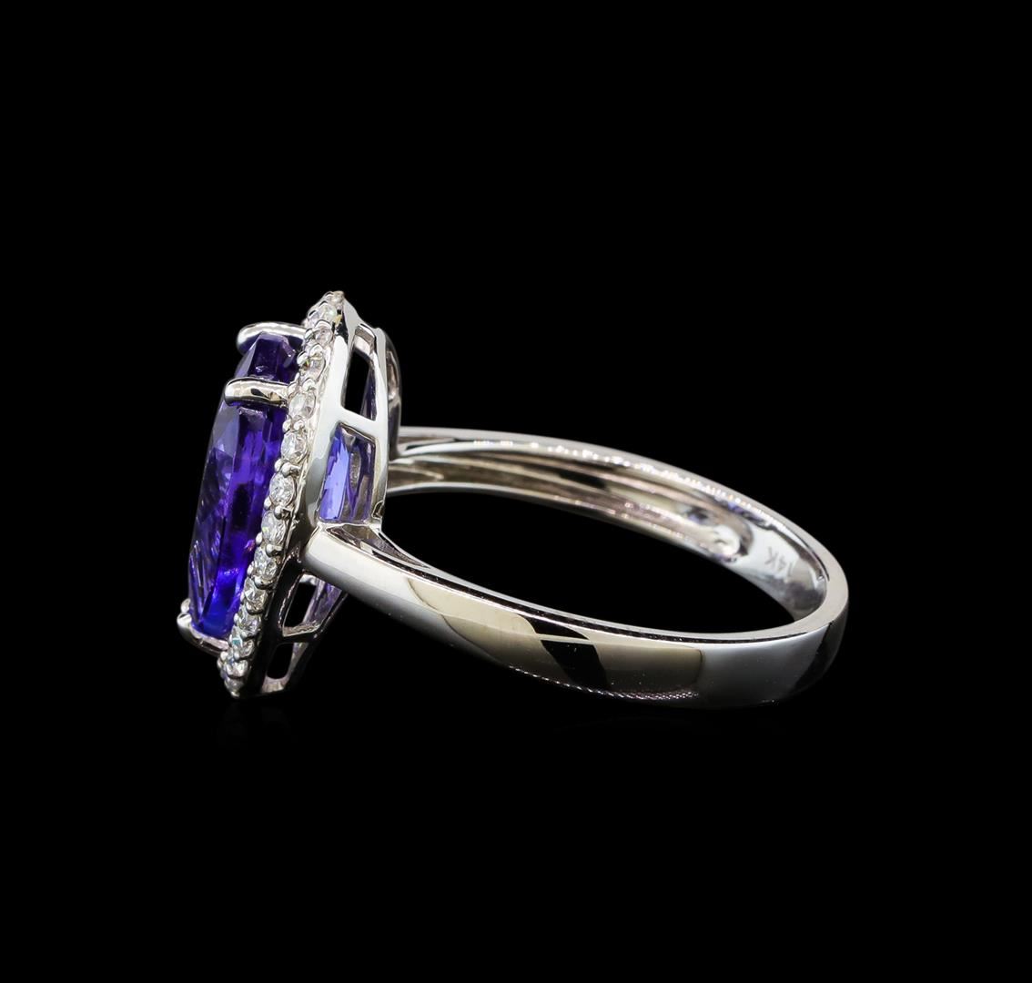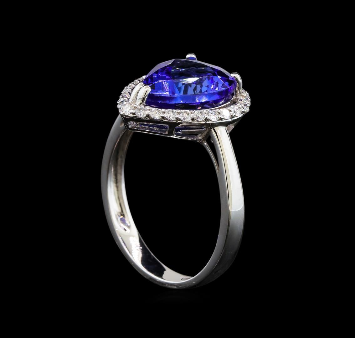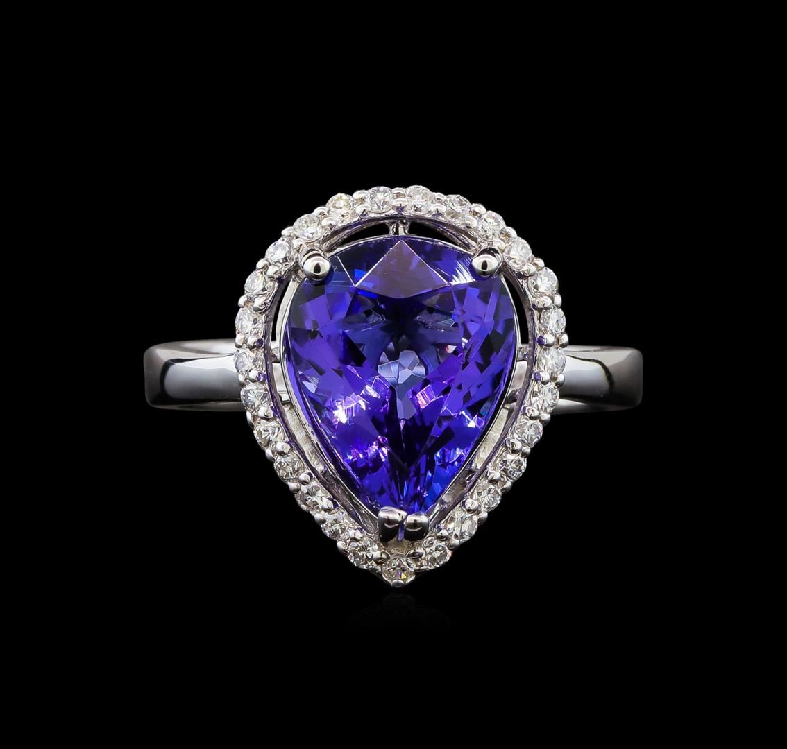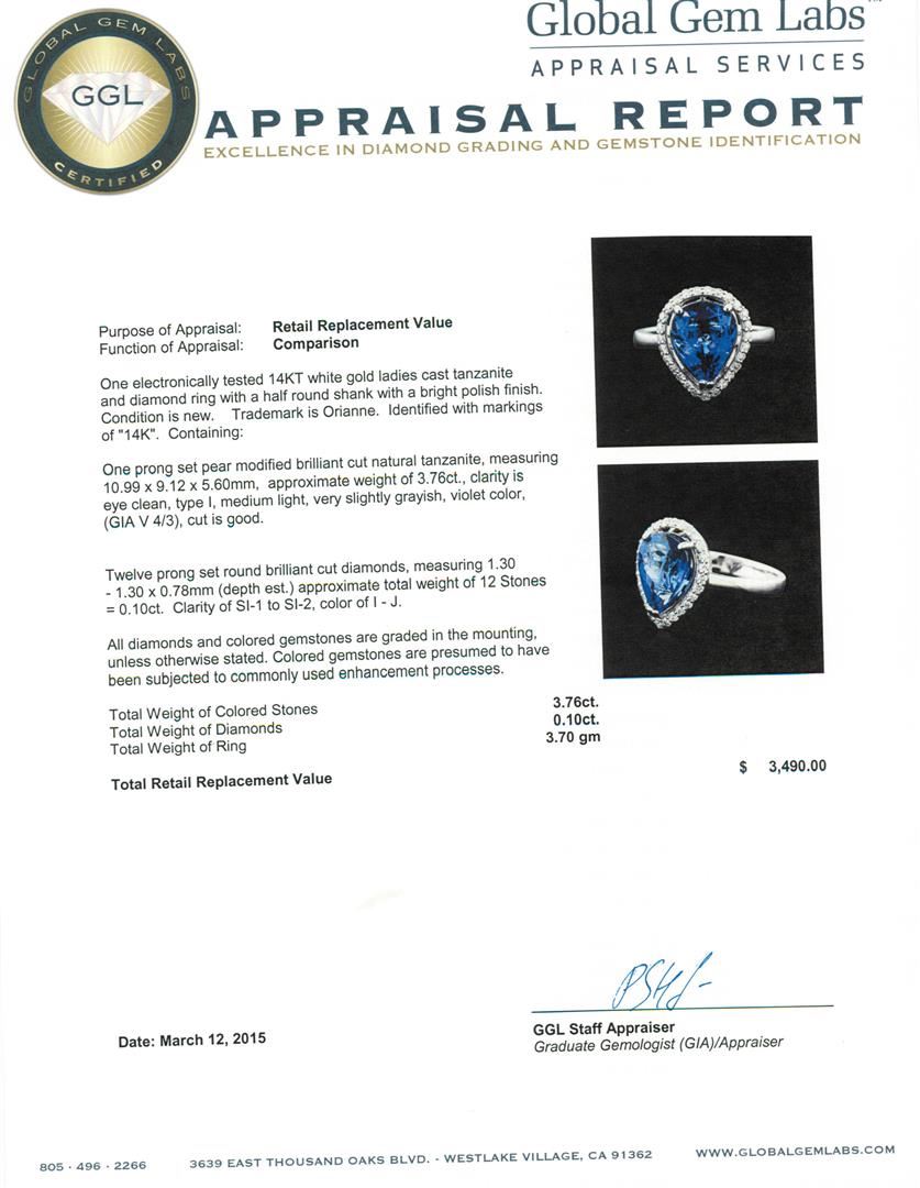 One electronically tested 14KT white gold ladies cast tanzanite and diamond ring with a half round shank with a bright polish finish. Trademark is Orianne. Identified with markings of "14K". Condition is new. Containing: One prong set pear modified brilliant cut natural tanzanite, measuring 10.99 x 9.12 x 5.60mm, approximate weight of 3.76ct., clarity is eye clean, type I, medium light, very slightly grayish, violet color, (GIA V 4/3), cut is good. Twelve prong set round brilliant cut diamonds, measuring 1.30 - 1.30 x 0.78mm (depth est.) approximate total weight of 12 Stones = 0.10ct. Clarity: SI-1 to SI-2. Color: I - J. All diamonds and colored gemstones are graded in the mounting, unless otherwise stated. Colored gemstones are presumed to have been subjected to commonly used enhancement processes. Total Weight of Colored Stones 3.76ct. Total Weight of Diamonds 0.10ct. Total Weight of Ring 3.70 grams. GGL Appraised at $3,490.00.