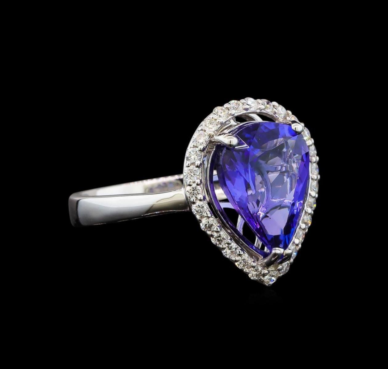 One electronically tested 14KT white gold ladies cast tanzanite and diamond ring with a half round shank with a bright polish finish. Trademark is Orianne. Identified with markings of "14K". Condition is new. Containing: One prong set pear modified brilliant cut natural tanzanite, measuring 10.99 x 9.12 x 5.60mm, approximate weight of 3.76ct., clarity is eye clean, type I, medium light, very slightly grayish, violet color, (GIA V 4/3), cut is good. Twelve prong set round brilliant cut diamonds, measuring 1.30 - 1.30 x 0.78mm (depth est.) approximate total weight of 12 Stones = 0.10ct. Clarity: SI-1 to SI-2. Color: I - J. All diamonds and colored gemstones are graded in the mounting, unless otherwise stated. Colored gemstones are presumed to have been subjected to commonly used enhancement processes. Total Weight of Colored Stones 3.76ct. Total Weight of Diamonds 0.10ct. Total Weight of Ring 3.70 grams. GGL Appraised.