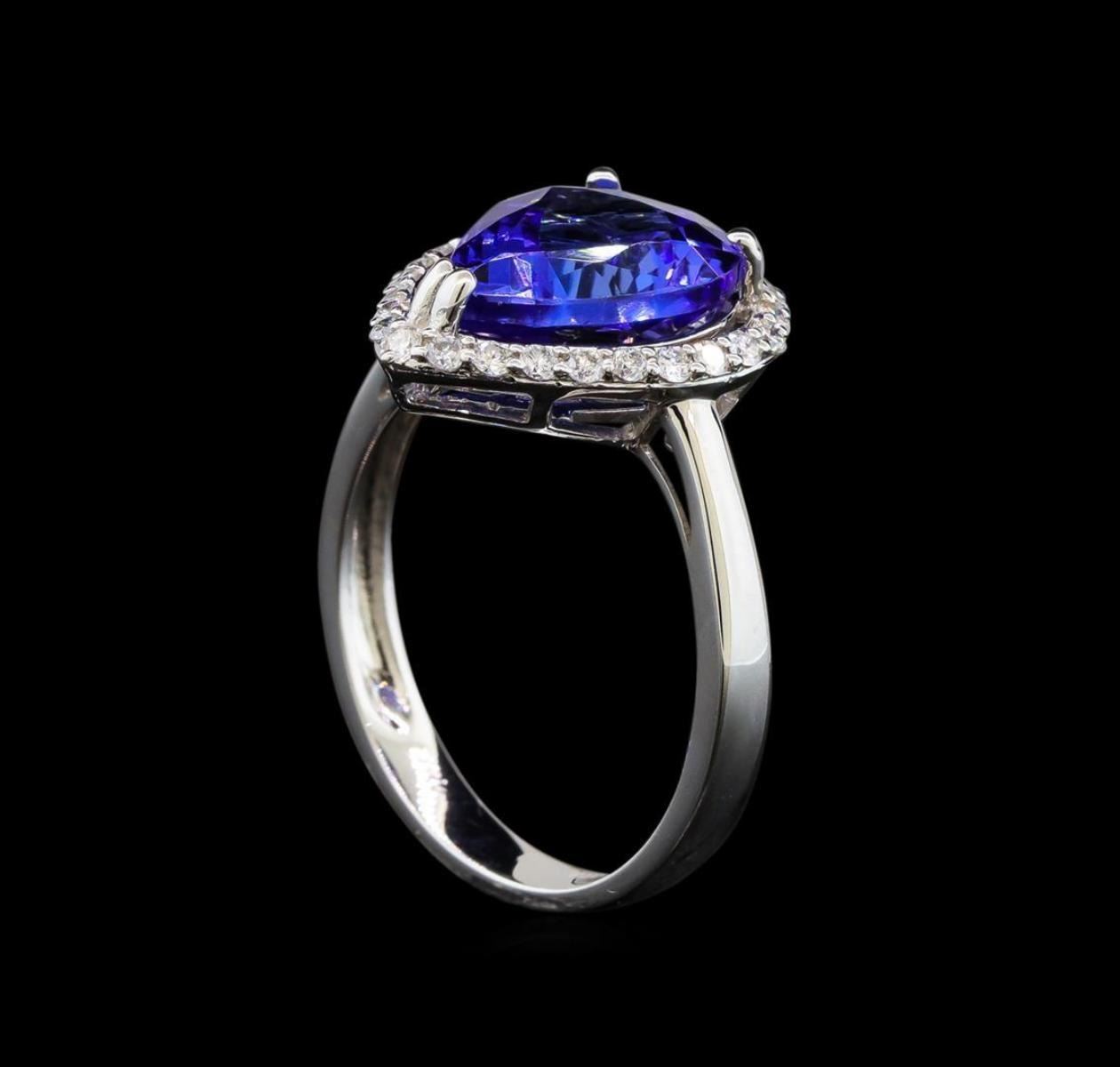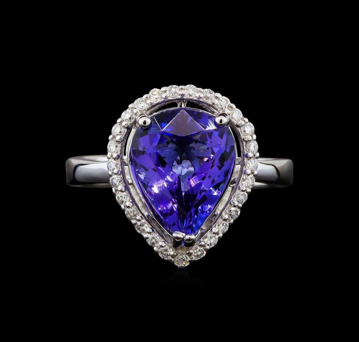 One electronically tested 14KT white gold ladies cast tanzanite and diamond ring with a half round shank with a bright polish finish. Trademark is Orianne. Identified with markings of "14K". Condition is new. Containing: One prong set pear modified brilliant cut natural tanzanite, measuring 10.99 x 9.12 x 5.60mm, approximate weight of 3.76ct., clarity is eye clean, type I, medium light, very slightly grayish, violet color, (GIA V 4/3), cut is good. Twelve prong set round brilliant cut diamonds, measuring 1.30 - 1.30 x 0.78mm (depth est.) approximate total weight of 12 Stones = 0.10ct. Clarity: SI-1 to SI-2. Color: I - J. All diamonds and colored gemstones are graded in the mounting, unless otherwise stated. Colored gemstones are presumed to have been subjected to commonly used enhancement processes. Total Weight of Colored Stones 3.76ct. Total Weight of Diamonds 0.10ct. Total Weight of Ring 3.70 grams. GGL Appraised.