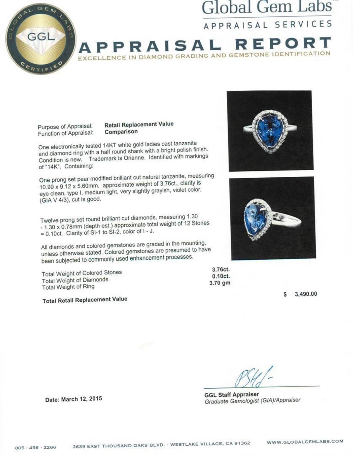 One electronically tested 14KT white gold ladies cast tanzanite and diamond ring with a half round shank with a bright polish finish. Trademark is Orianne. Identified with markings of "14K". Condition is new. Containing: One prong set pear modified brilliant cut natural tanzanite, measuring 10.99 x 9.12 x 5.60mm, approximate weight of 3.76ct., clarity is eye clean, type I, medium light, very slightly grayish, violet color, (GIA V 4/3), cut is good. Twelve prong set round brilliant cut diamonds, measuring 1.30 - 1.30 x 0.78mm (depth est.) approximate total weight of 12 Stones = 0.10ct. Clarity: SI-1 to SI-2. Color: I - J. All diamonds and colored gemstones are graded in the mounting, unless otherwise stated. Colored gemstones are presumed to have been subjected to commonly used enhancement processes. Total Weight of Colored Stones 3.76ct. Total Weight of Diamonds 0.10ct. Total Weight of Ring 3.70 grams. GGL Appraised.
