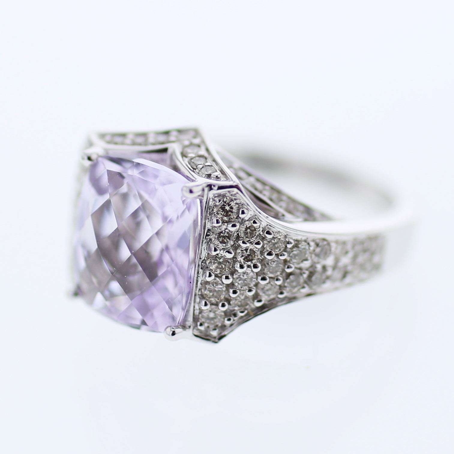 One 14KT White Gold 3.76ct Amethyst and Diamond Ring. (1) Amethyst stone with a total weight of 3.76cts. (82) Diamonds with a total weight of 0.89cts. Total weight of this ring is 6.55 grams.