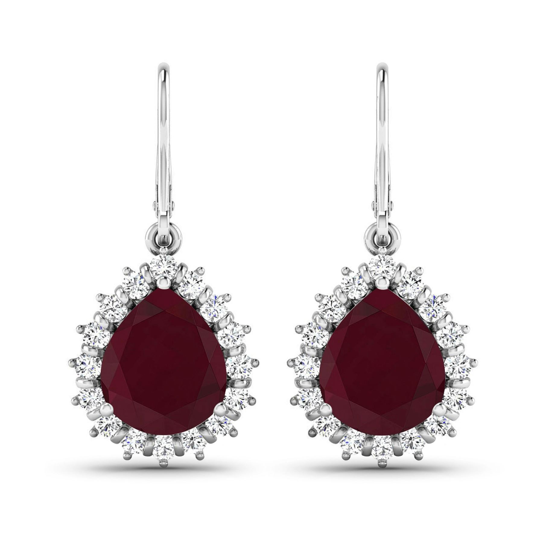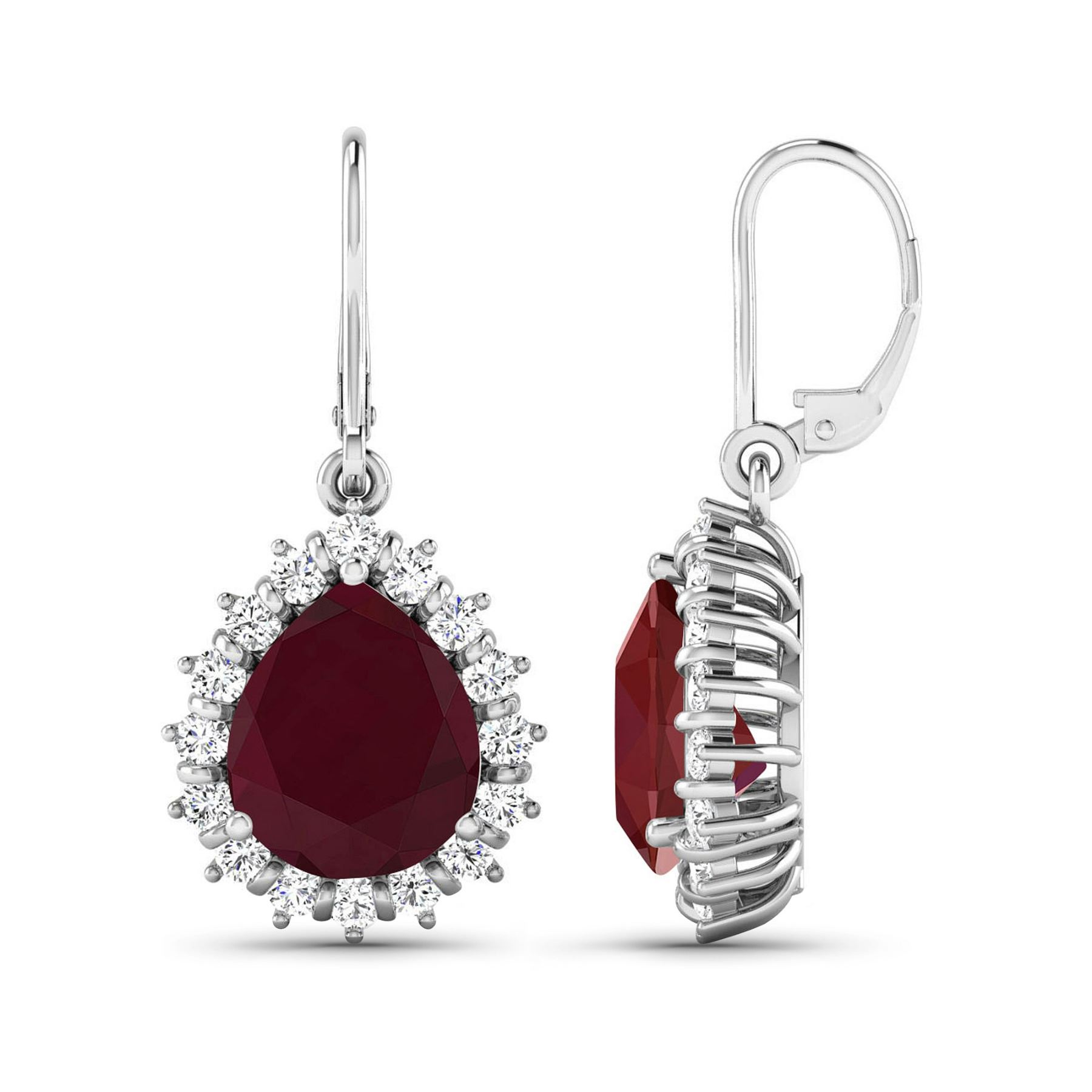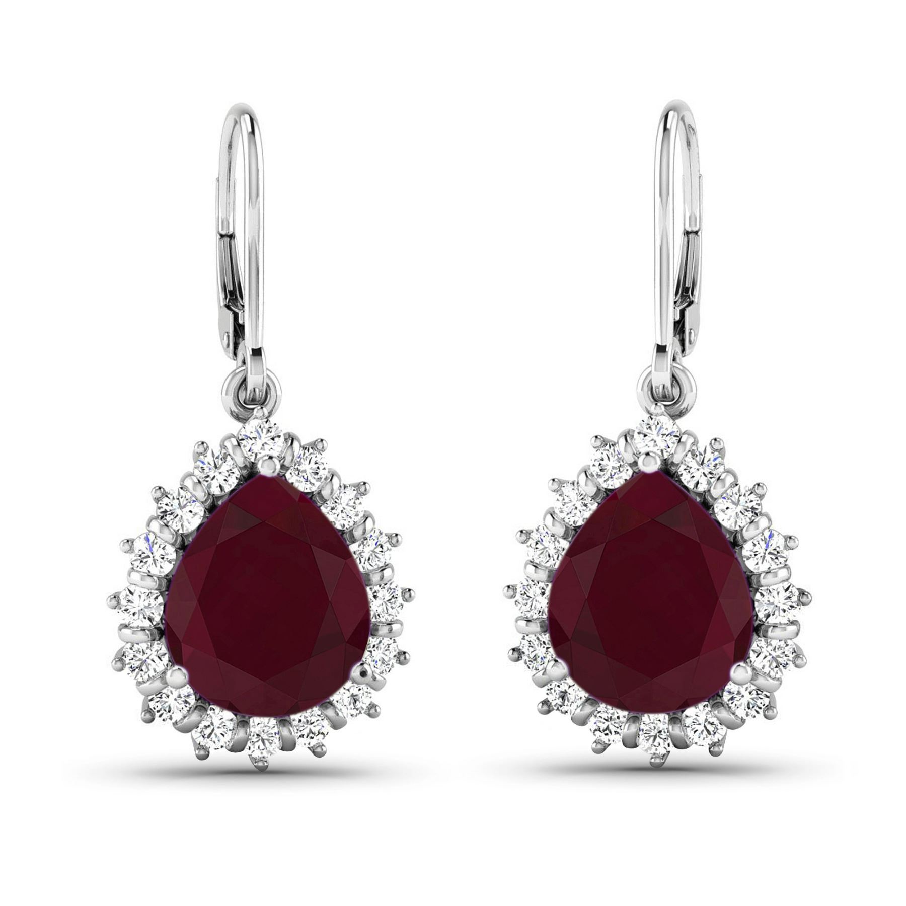 Ruby (AA) Pears 9x7mm - 2Pcs + White Diamond F/C Round 1.50mm - 32Pcs ( Diamond Quality : SI-2/HI ) ( Lever Back ) Total weight of gemstones is 3.7cts. Total Diamond weight is 0.44cts. Total weight of these earrings are 4.54 grams.