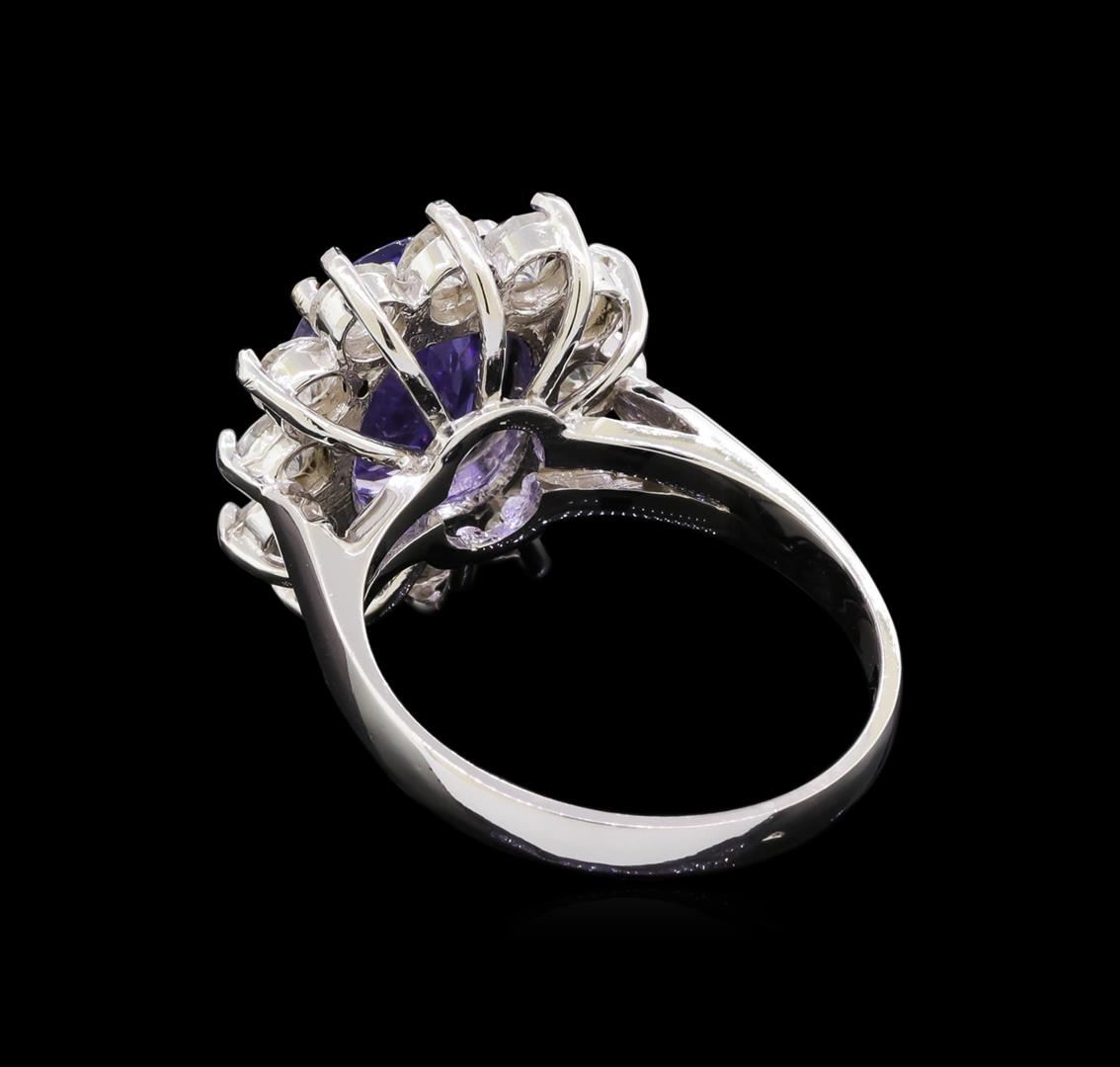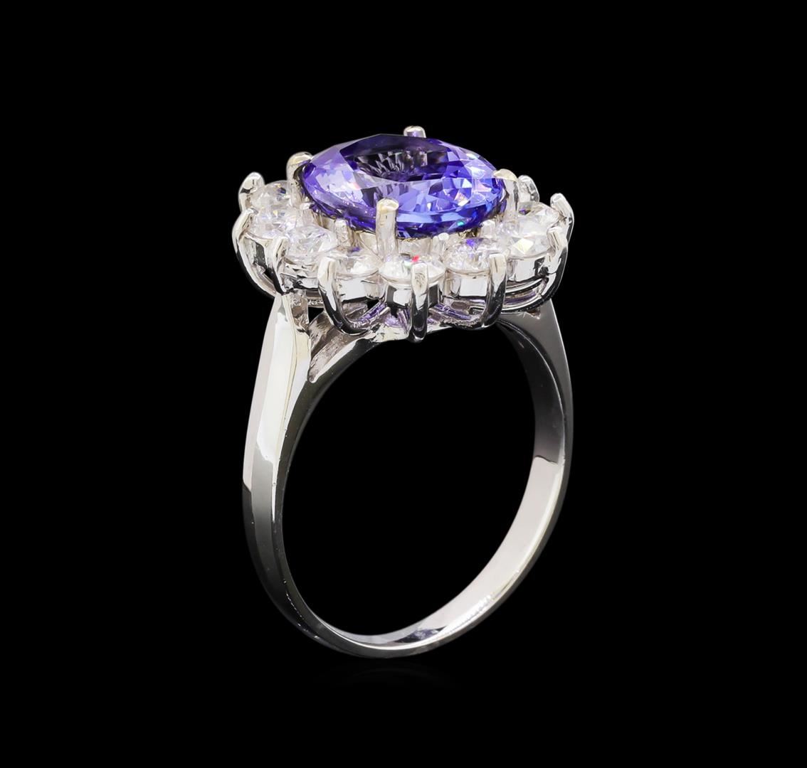 One electronically tested 14KT white gold ladies combination cast & assembled tanzanite and diamond ring with a flat shank with a bright polish finish. Identified with markings of "14K". Condition is new. Containing: One prong set oval modified brilliant cut natural tanzanite, measuring 11.08 x 9.01 x 5.62mm, approximate weight of 3.80ct., clarity is eye clean, type I, medium, moderately strong, violet color, (GIA V 5/4), cut is good. Twelve prong set round brilliant cut diamonds, measuring 3.20 - 3.20 x 1.92mm (depth est.) approximate total weight of 12 Stones = 1.44ct. Clarity: SI-2 to I-1. Color: I - J, Cut is Good. Colored gemstones are presumed to have been subjected to commonly used enhancement processes. All diamonds and colored gemstones are graded in the mounting, unless otherwise stated. Total Weight of Colored Stones 3.80ct. Total Weight of Diamonds 1.44ct. Total Weight of Ring 5.70 grams. GGL Appraised at $10,365.00.