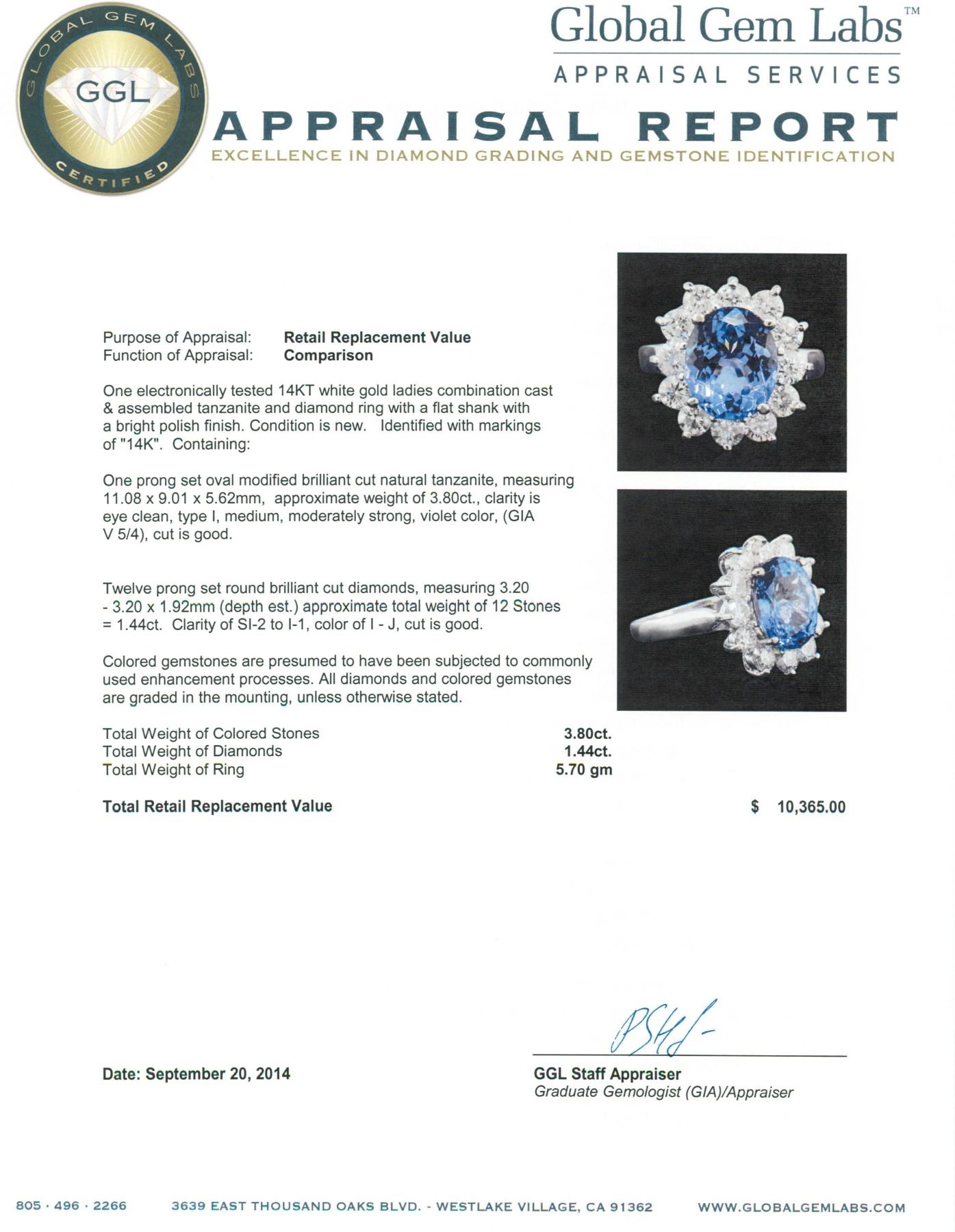 One electronically tested 14KT white gold ladies combination cast & assembled tanzanite and diamond ring with a flat shank with a bright polish finish. Identified with markings of "14K". Condition is new. Containing: One prong set oval modified brilliant cut natural tanzanite, measuring 11.08 x 9.01 x 5.62mm, approximate weight of 3.80 ct., clarity is eye clean, type I, medium, moderately strong, violet color, (GIA V 5/4), cut is good. Twelve prong set round brilliant cut diamonds, measuring 3.20 - 3.20 x 1.92mm (depth est.) approximate total weight of 12 Stones = 1.44ct. Clarity: SI-2 to I-1. Color: I - J, Cut is Good. Colored gemstones are presumed to have been subjected to commonly used enhancement processes. All diamonds and colored gemstones are graded in the mounting, unless otherwise stated. Total Weight of Colored Stones 3.80 ct. Total Weight of Diamonds 1.44ct. Total Weight of Ring 5.70 grams. GGL Appraised.
