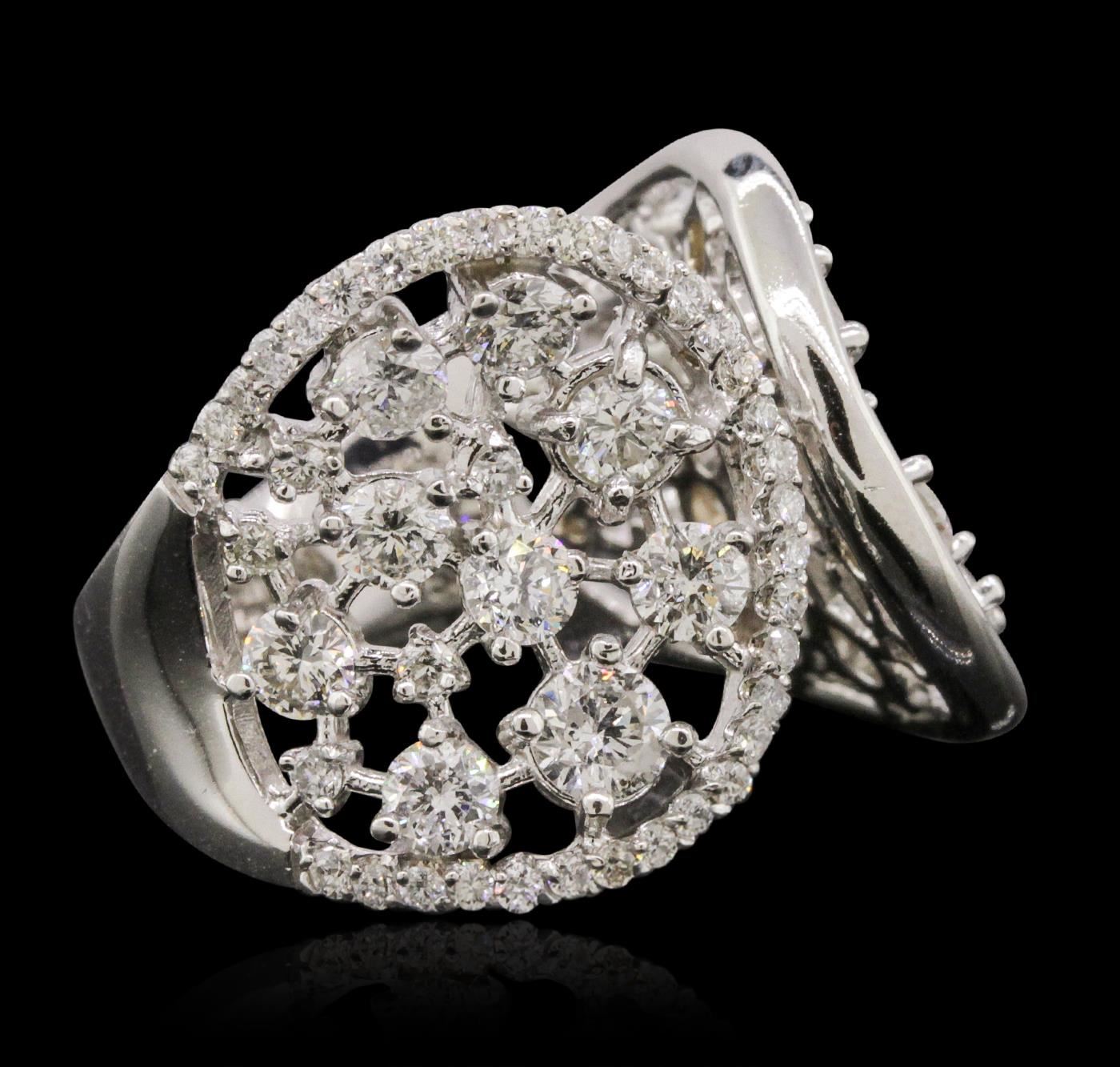 One electronically tested 14KT white gold ladies cast diamond ring with a bright polish finish. Condition is good. The ring features a stylized diamond set by-pass design, completed by a five millimeter wide band. Identified with markings of "14K". Containing: Five prong set round brilliant cut diamonds, measuring 4.10 - 4.00 x 2.43mm (depth est.) approximate. Total Weight of 5 Stones = 1.31ct. Graded in the setting. Clarity: SI-2 to I-1. Color: G - H Fifteen prong set round brilliant cut diamonds, measuring 3.30 - 3.00 x 1.89mm (depth est.) approximate. Total Weight of 15 Stones = 1.81ct. Graded in the setting. Clarity: SI-1 to I-1. Color: G - H Forty-Four prong set round brilliant cut diamonds, measuring 1.60 - 1.50 x 0.93mm (depth est.) approximate. Total Weight of 44 Stones = 0.69ct. Graded in the setting. Clarity: SI-1 to I-1. Color: G - H. Total Weight of Diamonds 3.81ct. Total Weight of Ring 10.28gm. AIG Appraised at $14,930.00.