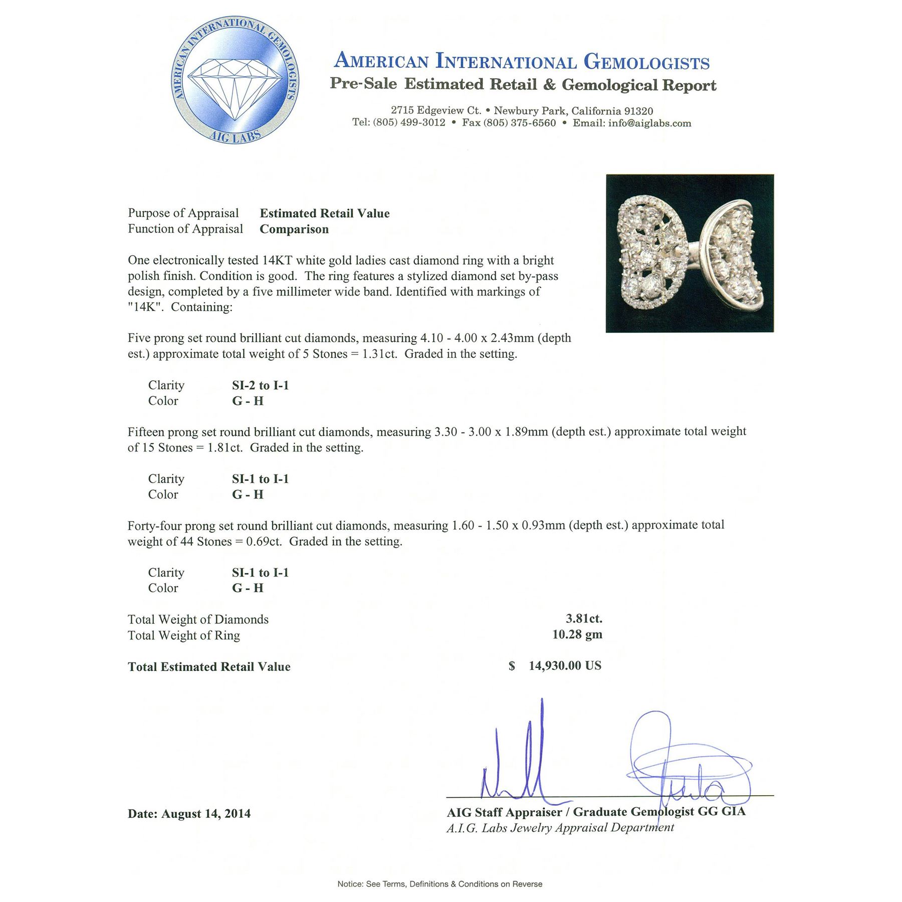 One electronically tested 14KT white gold ladies cast diamond ring with a bright polish finish. Condition is good. The ring features a stylized diamond set by-pass design, completed by a five millimeter wide band. Identified with markings of "14K". Containing: Five prong set round brilliant cut diamonds, measuring 4.10 - 4.00 x 2.43mm (depth est.) approximate. Total Weight of 5 Stones = 1.31ct. Graded in the setting. Clarity: SI-2 to I-1. Color: G - H Fifteen prong set round brilliant cut diamonds, measuring 3.30 - 3.00 x 1.89mm (depth est.) approximate. Total Weight of 15 Stones = 1.81ct. Graded in the setting. Clarity: SI-1 to I-1. Color: G - H Forty-Four prong set round brilliant cut diamonds, measuring 1.60 - 1.50 x 0.93mm (depth est.) approximate. Total Weight of 44 Stones = 0.69ct. Graded in the setting. Clarity: SI-1 to I-1. Color: G - H. Total Weight of Diamonds 3.81ct. Total Weight of Ring 10.28gm. AIG Appraised.