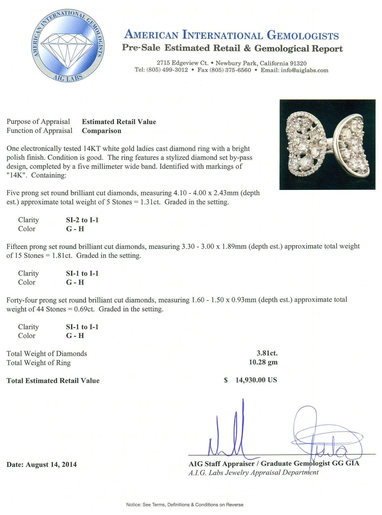 One electronically tested 14KT white gold ladies cast diamond ring with a bright polish finish. Condition is good. The ring features a stylized diamond set by-pass design, completed by a five millimeter wide band. Identified with markings of "14K". Containing: Five prong set round brilliant cut diamonds, measuring 4.10 - 4.00 x 2.43mm (depth est.) approximate. Total Weight of 5 Stones = 1.31ct. Graded in the setting. Clarity: SI-2 to I-1. Color: G - H Fifteen prong set round brilliant cut diamonds, measuring 3.30 - 3.00 x 1.89mm (depth est.) approximate. Total Weight of 15 Stones = 1.81ct. Graded in the setting. Clarity: SI-1 to I-1. Color: G - H Forty-Four prong set round brilliant cut diamonds, measuring 1.60 - 1.50 x 0.93mm (depth est.) approximate. Total Weight of 44 Stones = 0.69ct. Graded in the setting. Clarity: SI-1 to I-1. Color: G - H. Total Weight of Diamonds 3.81ct. Total Weight of Ring 10.28gm. AIG Appraised.