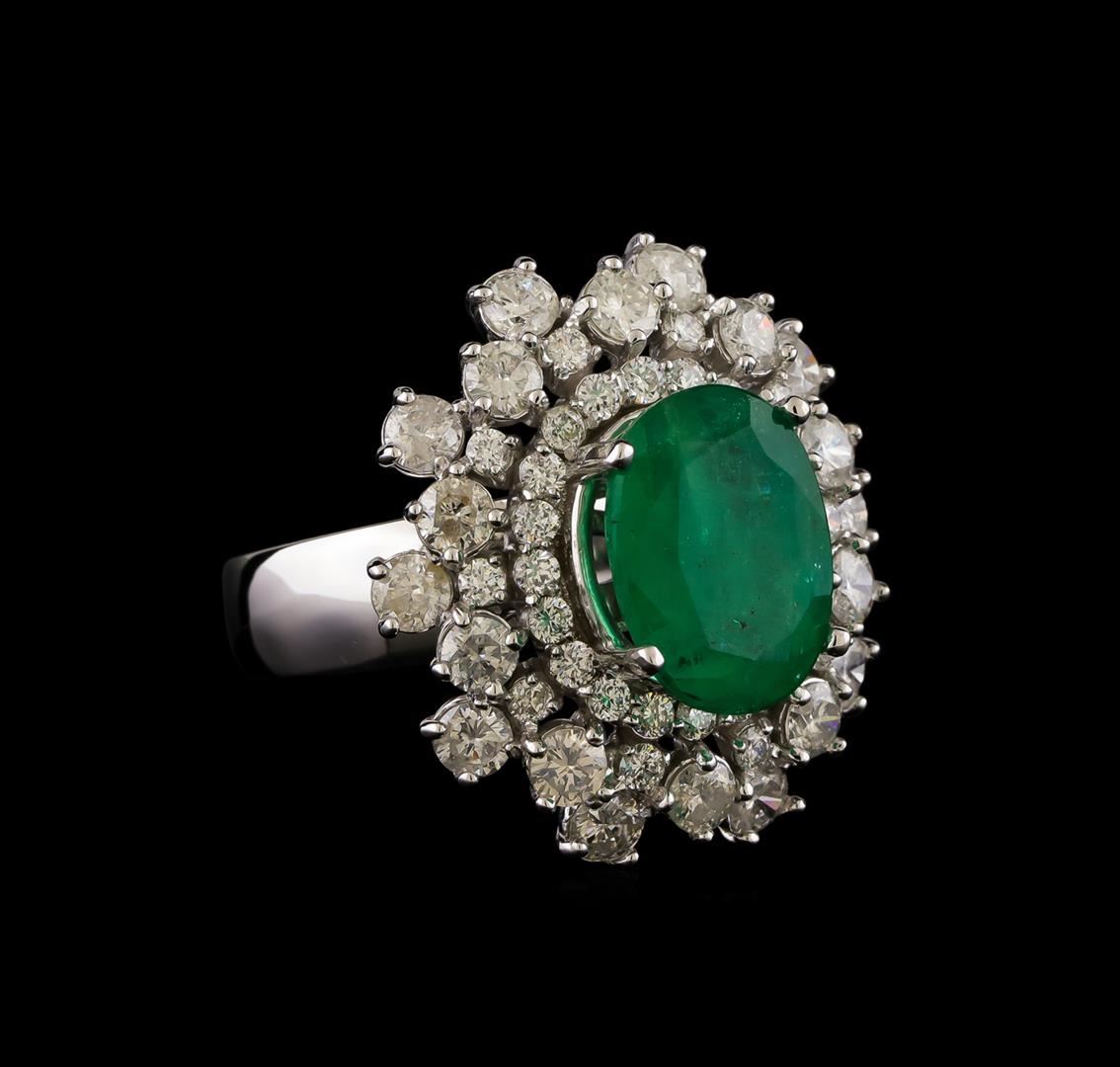 One electronically tested 14KT white gold ladies combination cast & assembled emerald and diamond ring with a flat shank with a bright polish finish. Identified with markings of "14K". Condition is new. Containing: One prong set oval modified brilliant cut natural emerald, measuring 12.50 x 9.17 x 5.96mm, approximate weight of 3.81ct., clarity is heavily included, type III, medium, very slightly grayish, green color, (GIA G 5/3), cut is good. Twenty-One prong set round brilliant cut diamonds, measuring 3.00 - 3.00 x 1.80mm (depth est.) approximate total weight of 21 Stones = 2.08ct. Clarity: SI-2 to I-2. Color: I - J, Cut is Good. Thirty-Two prong set round brilliant cut diamonds, measuring 1.50 - 1.50 x 0.90mm (depth est.) approximate total weight of 32 Stones = 0.39ct. Clarity: SI-1 to I-1. Color: I - J, Cut is Good. Colored gemstones are presumed to have been subjected to commonly used enhancement processes. All diamonds and colored gemstones are graded in the mounting, unless otherwise stated. Total Weight of Colored Stones 3.81ct. Total Weight of Diamonds 2.47ct. Total Weight of Ring 11.50 grams. GGL Appraised at $8,885.00.