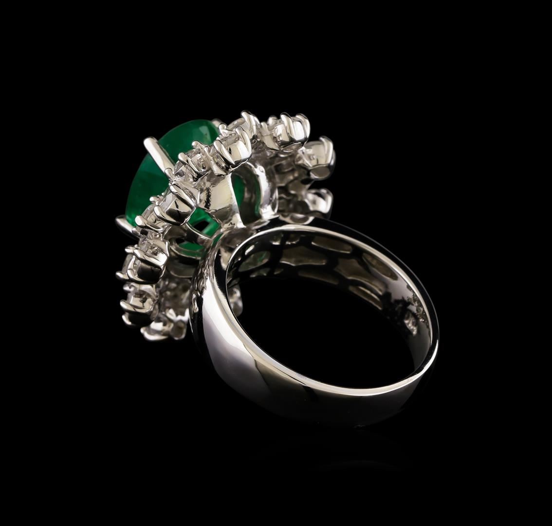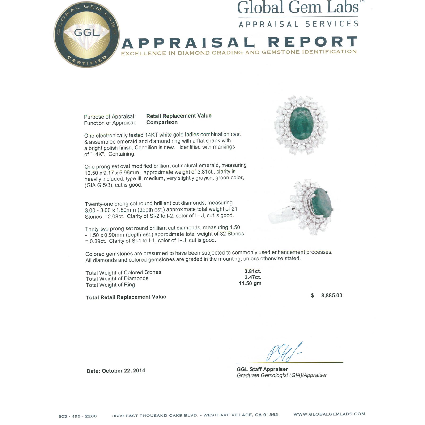 One electronically tested 14KT white gold ladies combination cast & assembled emerald and diamond ring with a flat shank with a bright polish finish. Identified with markings of "14K". Condition is new. Containing: One prong set oval modified brilliant cut natural emerald, measuring 12.50 x 9.17 x 5.96mm, approximate weight of 3.81ct., clarity is heavily included, type III, medium, very slightly grayish, green color, (GIA G 5/3), cut is good. Twenty-One prong set round brilliant cut diamonds, measuring 3.00 - 3.00 x 1.80mm (depth est.) approximate total weight of 21 Stones = 2.08ct. Clarity: SI-2 to I-2. Color: I - J, Cut is Good. Thirty-Two prong set round brilliant cut diamonds, measuring 1.50 - 1.50 x 0.90mm (depth est.) approximate total weight of 32 Stones = 0.39ct. Clarity: SI-1 to I-1. Color: I - J, Cut is Good. Colored gemstones are presumed to have been subjected to commonly used enhancement processes. All diamonds and colored gemstones are graded in the mounting, unless otherwise stated. Total Weight of Colored Stones 3.81ct. Total Weight of Diamonds 2.47ct. Total Weight of Ring 11.50 grams. GGL Appraised at $8,885.00.