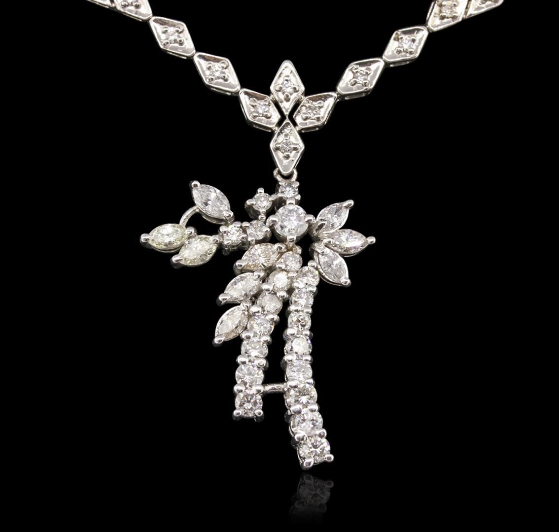 One electronically tested 14KT white gold Ladies combination cast & assembled necklace with a hidden box clasp with a bright polish finish. Condition is very good. Identified with markings of "14K". Containing: Eighty-Four prong set round brilliant cut diamonds, measuring 1.30 - 1.30 x 0.78mm (depth est.) approximate. Total Weight of 84 Stones = 0.67ct. Clarity: SI-1 to SI-2. Color: H - I, Cut is Good. Fourteen prong set round brilliant cut diamonds, measuring 3.20 - 3.20 x 1.92mm (depth est.) approximate. Total Weight of 14 Stones = 1.68ct. Clarity: SI-1 to I-1. Color: I - K, Cut is Good. One prong set round brilliant cut diamond, measuring 3.70 - 3.70 x 2.22mm (depth est.) approximate weight of 0.19ct. Clarity: I-1. Color: H, Cut is Good. Nine prong set marquise shaped cut diamonds, measuring 5.00 x 2.80 x 1.76mm (depth est.) approximate. Total Weight of 9 Stones = 1.29ct. Clarity: SI-1 to I-1. Color: J - L, Cut is Good. All diamonds are graded in the mounting, unless otherwise stated. Total Weight of Diamonds 3.82ct. Total Weight of Necklace 27.60 grams. GGL Appraised at $14,145.00.