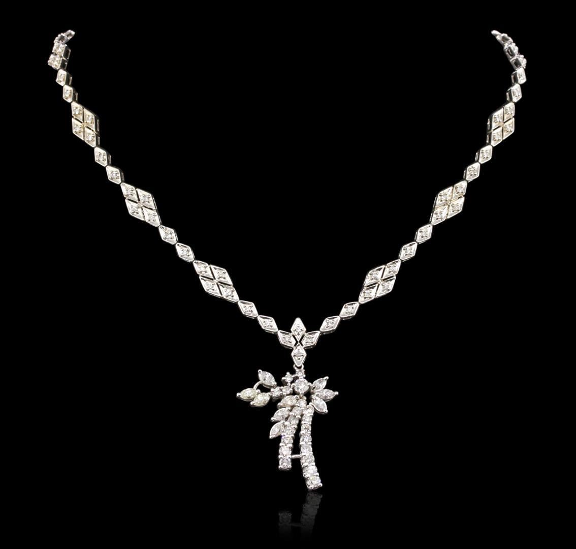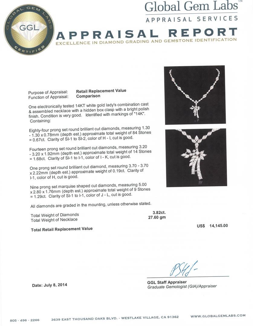 One electronically tested 14KT white gold Ladies combination cast & assembled necklace with a hidden box clasp with a bright polish finish. Condition is very good. Identified with markings of "14K". Containing: Eighty-Four prong set round brilliant cut diamonds, measuring 1.30 - 1.30 x 0.78mm (depth est.) approximate. Total Weight of 84 Stones = 0.67ct. Clarity: SI-1 to SI-2. Color: H - I, Cut is Good. Fourteen prong set round brilliant cut diamonds, measuring 3.20 - 3.20 x 1.92mm (depth est.) approximate. Total Weight of 14 Stones = 1.68ct. Clarity: SI-1 to I-1. Color: I - K, Cut is Good. One prong set round brilliant cut diamond, measuring 3.70 - 3.70 x 2.22mm (depth est.) approximate weight of 0.19ct. Clarity: I-1. Color: H, Cut is Good. Nine prong set marquise shaped cut diamonds, measuring 5.00 x 2.80 x 1.76mm (depth est.) approximate. Total Weight of 9 Stones = 1.29ct. Clarity: SI-1 to I-1. Color: J - L, Cut is Good. All diamonds are graded in the mounting, unless otherwise stated. Total Weight of Diamonds 3.82ct. Total Weight of Necklace 27.60 grams. GGL Appraised.