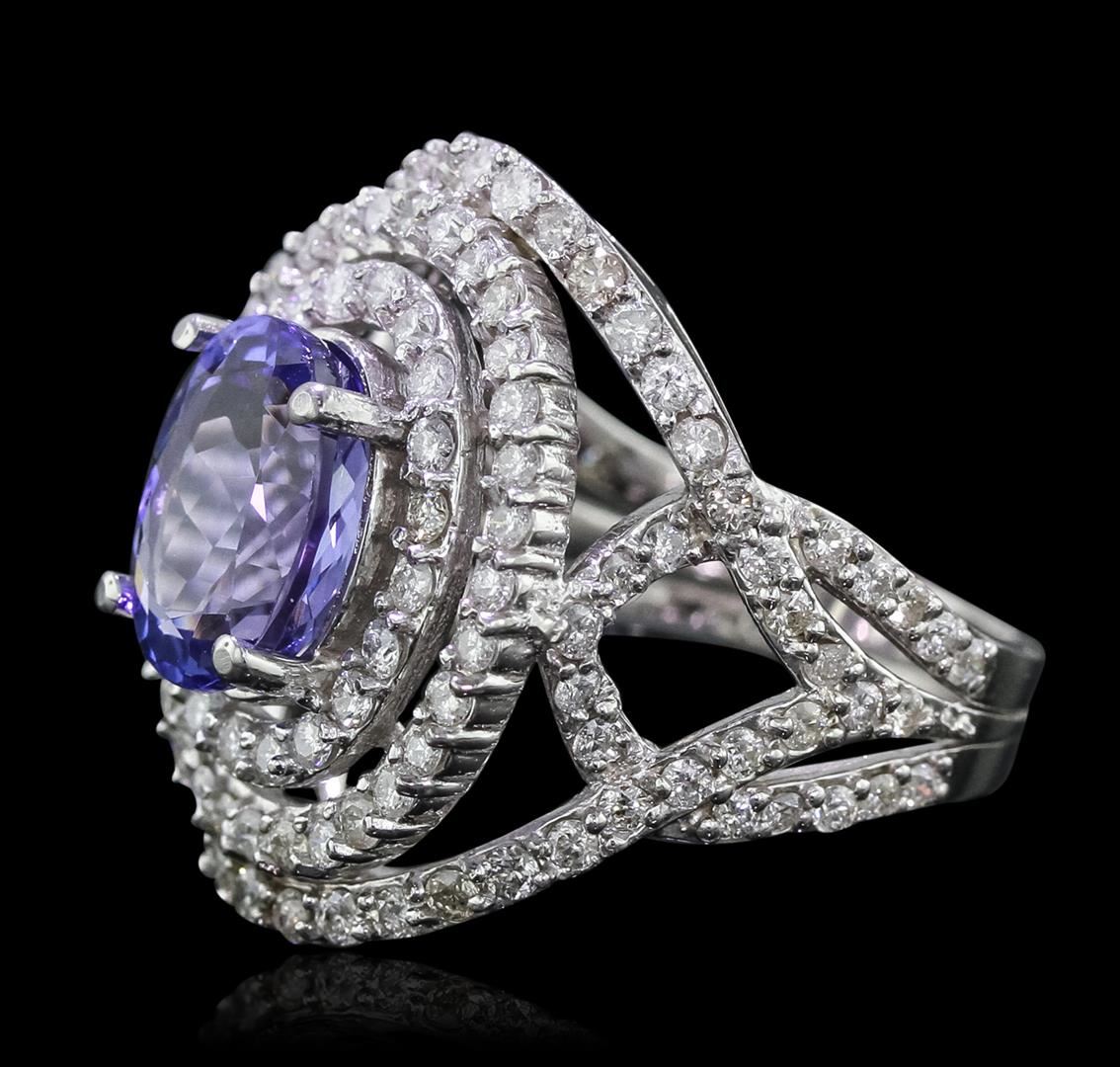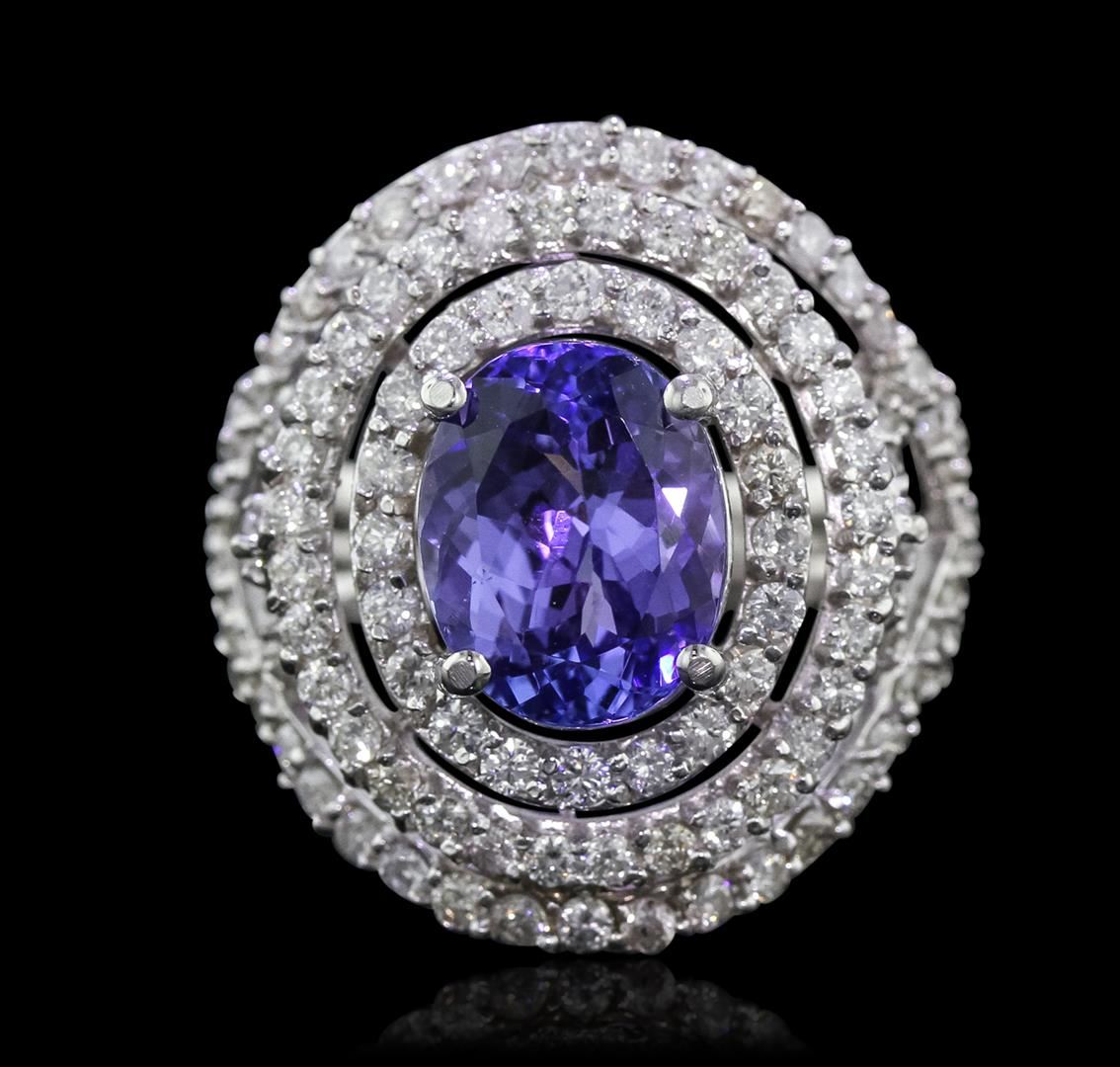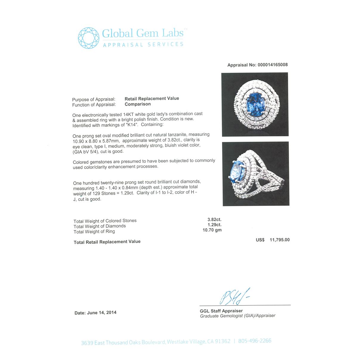 One electronically tested 14KT white gold Ladies combination cast & assembled ring with a bright polish finish. Condition is new. Identified with markings of "K14". Containing: One prong set oval modified brilliant cut natural tanzanite, measuring 10.90 x 8.80 x 5.87mm, approximate weight of 3.82ct., clarity is eye clean, type I, medium, moderately strong, bluish violet color, (GIA bV 5/4), cut is good. Colored gemstones are presumed to have been subjected to commonly used color/clarity enhancement processes. One Hundred Twenty-Nine prong set round brilliant cut diamonds, measuring 1.40 - 1.40 x 0.84mm (depth est.) approximate. Total Weight of 129 Stones = 1.29ct. Clarity: I-1 to I-2. Color: H - J, Cut is Good. Total Weight of Colored Stones 3.82ct. Total Weight of Diamonds 1.29ct. Total Weight of Ring 10.70 grams. GGL Appraised at $11,795.00.