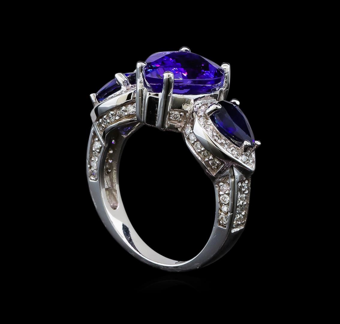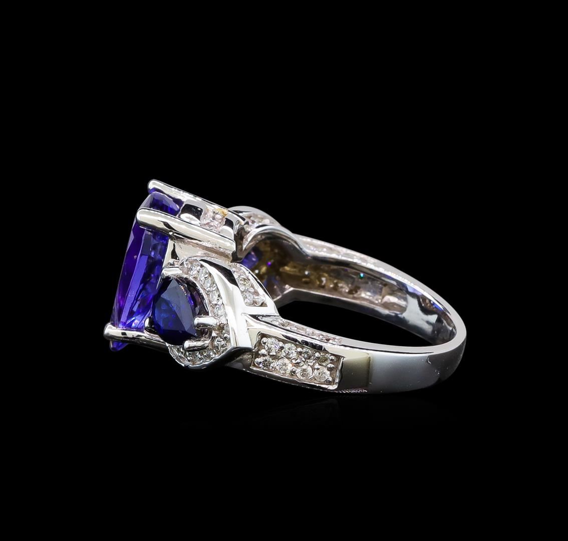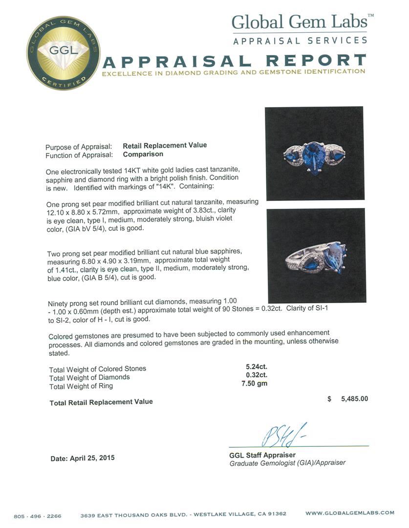 One electronically tested 14KT white gold ladies cast tanzanite, sapphire and diamond ring with a bright polish finish. Identified with markings of "14K". Condition is new. Containing: One prong set pear modified brilliant cut natural tanzanite, measuring 12.10 x 8.80 x 5.72mm, approximate weight of 3.83ct., clarity is eye clean, type I, medium, moderately strong, bluish violet color, (GIA bV 5/4), cut is good. Two prong set pear modified brilliant cut natural blue sapphires, measuring 6.80 x 4.90 x 3.19mm, approximate total weight of 1.41ct., clarity is eye clean, type II, medium, moderately strong, blue color, (GIA B 5/4), cut is good. Ninety prong set round brilliant cut diamonds, measuring 1.00 - 1.00 x 0.60mm (depth est.) approximate total weight of 90 Stones = 0.32ct. Clarity: SI-1 to SI-2. Color: H - I, Cut is Good. Colored gemstones are presumed to have been subjected to commonly used enhancement processes. All diamonds and colored gemstones are graded in the mounting, unless otherwise stated. Total Weight of Colored Stones 5.24ct. Total Weight of Diamonds 0.32ct. Total Weight of Ring 7.50 grams. GGL Appraised at $5,485.00.