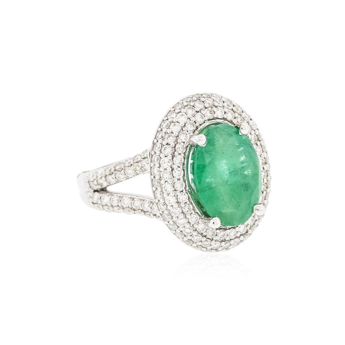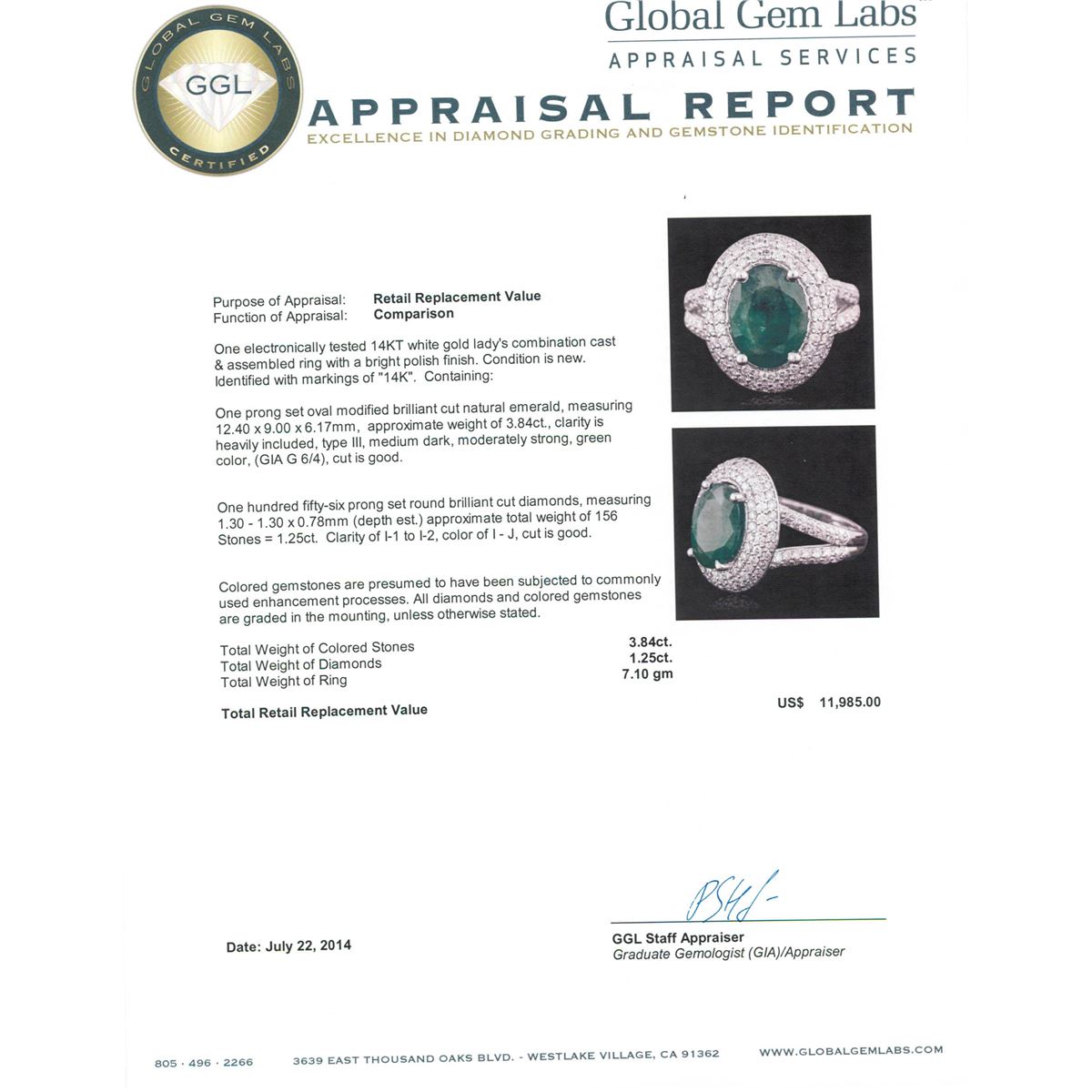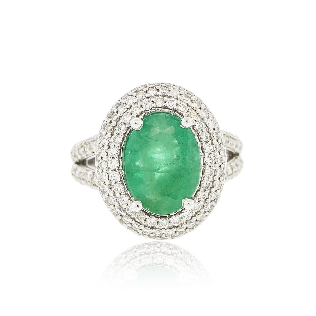 One electronically tested 14KT white gold ladies combination cast & assembled ring with a bright polish finish. Condition is new. Identified with markings of "14K". Containing: One prong set oval modified brilliant cut natural emerald, measuring 12.40 x 9.00 x 6.17mm, approximate weight of 3.84ct., clarity is heavily included, type III, medium dark, moderately strong, green color, (GIA G 6/4), cut is good. One Hundred Fifty-Six prong set round brilliant cut diamonds, measuring 1.30 - 1.30 x 0.78mm (depth est.) approximate total weight of 156 Stones = 1.25ct. Clarity: I-1 to I-2. Color: I - J, Cut is Good. Colored gemstones are presumed to have been subjected to commonly used enhancement processes. All diamonds and colored gemstones are graded in the mounting, unless otherwise stated. Total Weight of Colored Stones 3.84ct. Total Weight of Diamonds 1.25ct. Total Weight of Ring 7.10 grams. GGL Appraised at $11,985.00.
