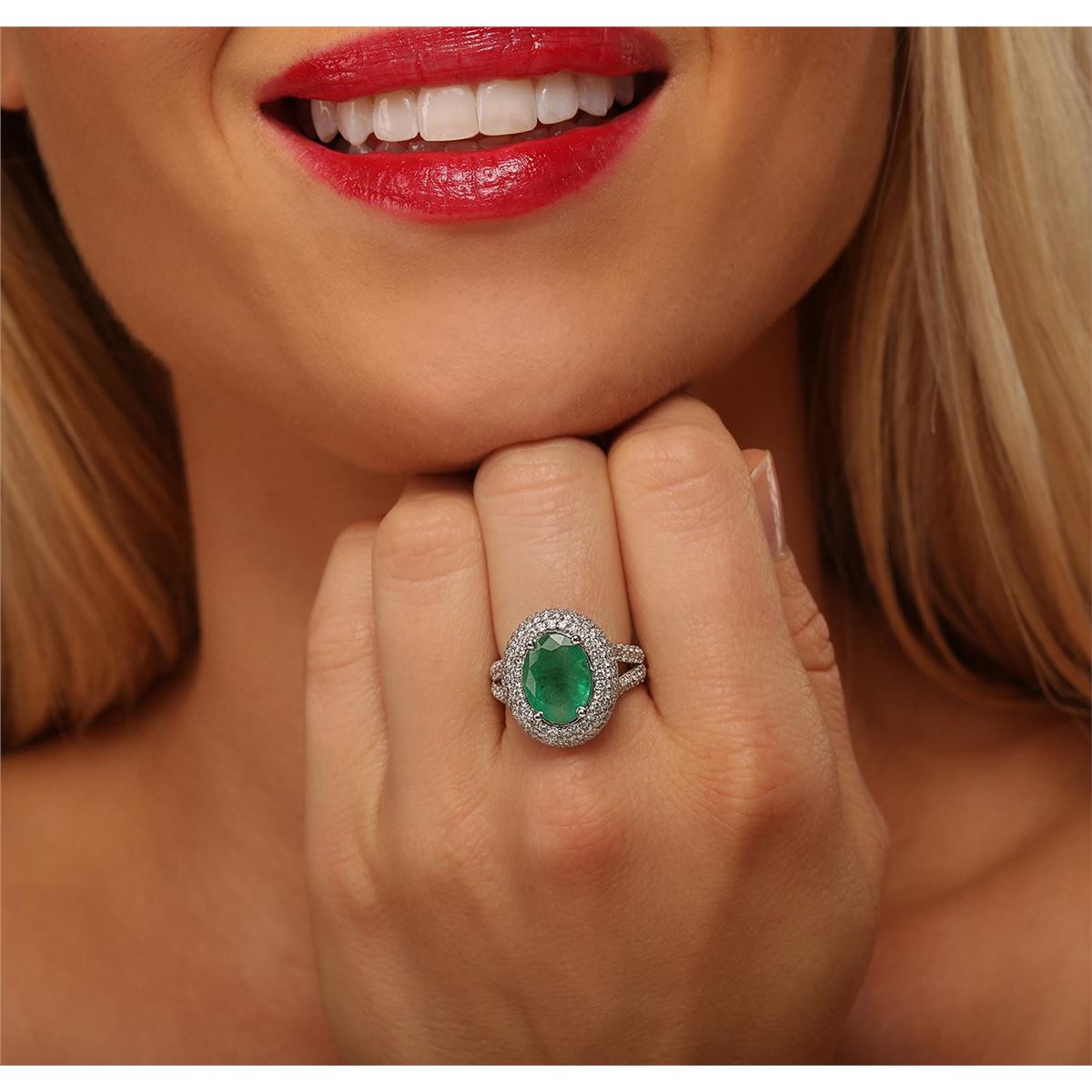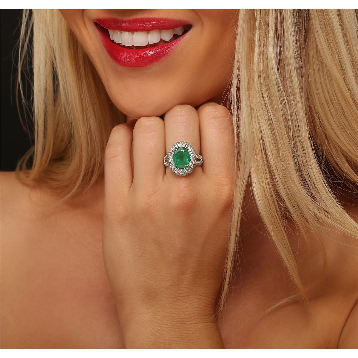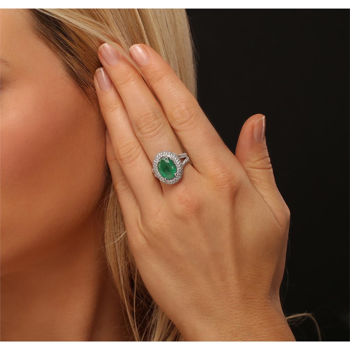 One electronically tested 14KT white gold ladies combination cast & assembled ring with a bright polish finish. Condition is new. Identified with markings of "14K". Containing: One prong set oval modified brilliant cut natural emerald, measuring 12.40 x 9.00 x 6.17mm, approximate weight of 3.84ct., clarity is heavily included, type III, medium dark, moderately strong, green color, (GIA G 6/4), cut is good. One Hundred Fifty-Six prong set round brilliant cut diamonds, measuring 1.30 - 1.30 x 0.78mm (depth est.) approximate total weight of 156 Stones = 1.25ct. Clarity: I-1 to I-2. Color: I - J, Cut is Good. Colored gemstones are presumed to have been subjected to commonly used enhancement processes. All diamonds and colored gemstones are graded in the mounting, unless otherwise stated. Total Weight of Colored Stones 3.84ct. Total Weight of Diamonds 1.25ct. Total Weight of Ring 7.10 grams. GGL Appraised at $11,985.00.