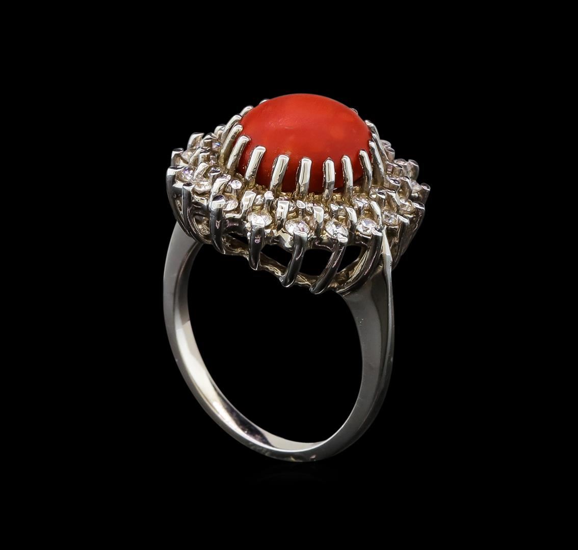 One electronically tested 14KT white gold ladies cast agate and diamond ring with a bright polish finish. Identified with markings of "14K". Condition is new. Containing: One prong set oval cabochon cut natural agate, measuring 10.50 x 8.00. x 0.00.mm, approximate weight of 3.85ct., clarity is heavily included, medium dark, brownish, red color, (GIA R 6/1), cut is good. Thirty-Six prong set round brilliant cut diamonds, measuring 1.60 - 1.60 x 0.96mm (depth est.) approximate total weight of 36 Stones = 0.73ct. Clarity: SI-2 to I-1. Color: H - I, Cut is Good. Colored gemstones are presumed to have been subjected to commonly used enhancement processes. All diamonds and colored gemstones are graded in the mounting, unless otherwise stated. Total Weight of Colored Stones 3.85ct. Total Weight of Diamonds 0.73ct. Total Weight of Ring 7.60 grams. GGL Appraised at $2,935.00.