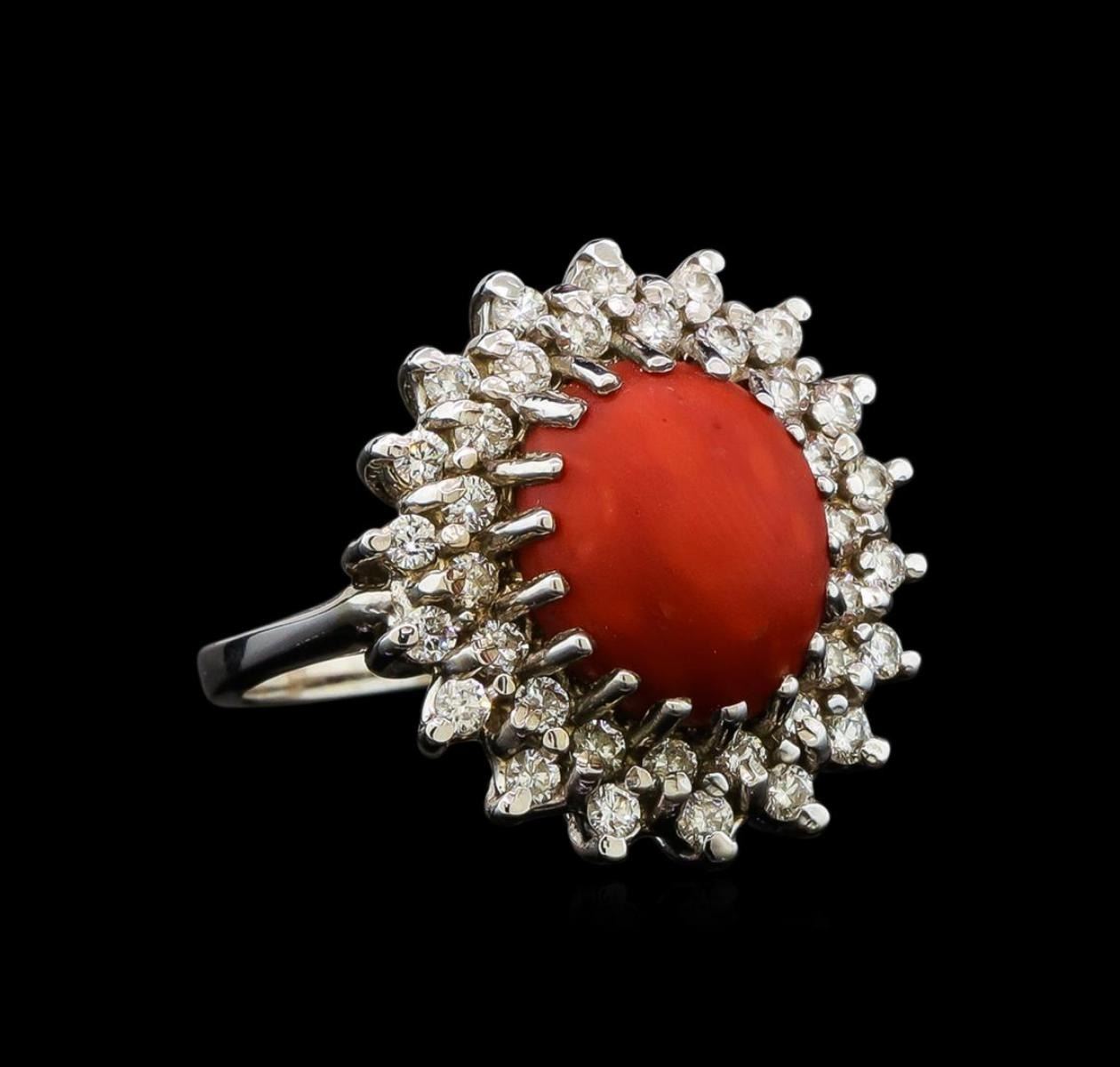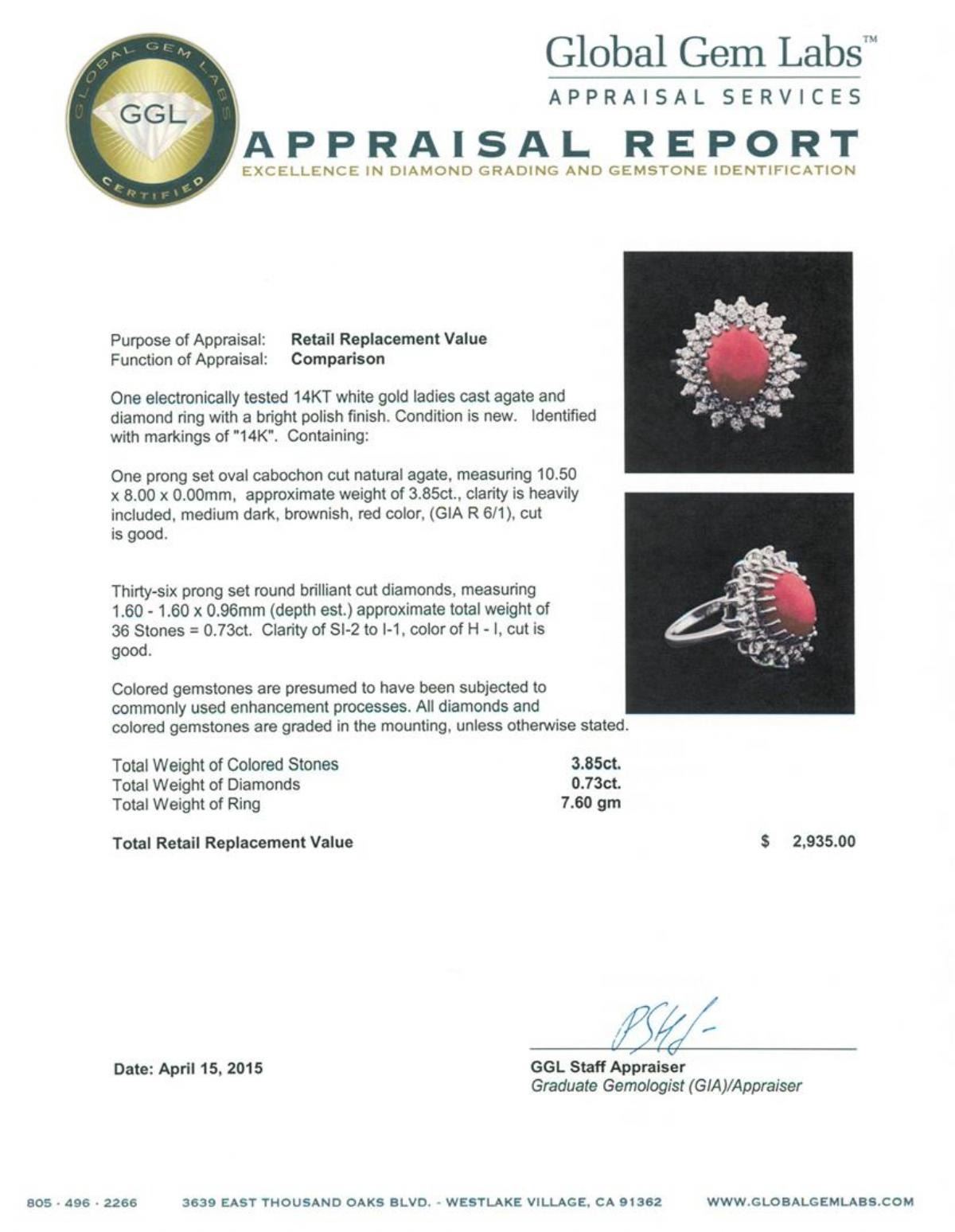 One electronically tested 14KT white gold ladies cast agate and diamond ring with a bright polish finish. Identified with markings of "14K". Condition is new. Containing: One prong set oval cabochon cut natural agate, measuring 10.50 x 8.00. x 0.00.mm, approximate weight of 3.85ct., clarity is heavily included, medium dark, brownish, red color, (GIA R 6/1), cut is good. Thirty-Six prong set round brilliant cut diamonds, measuring 1.60 - 1.60 x 0.96mm (depth est.) approximate total weight of 36 Stones = 0.73ct. Clarity: SI-2 to I-1. Color: H - I, Cut is Good. Colored gemstones are presumed to have been subjected to commonly used enhancement processes. All diamonds and colored gemstones are graded in the mounting, unless otherwise stated. Total Weight of Colored Stones 3.85ct. Total Weight of Diamonds 0.73ct. Total Weight of Ring 7.60 grams. GGL Appraised.