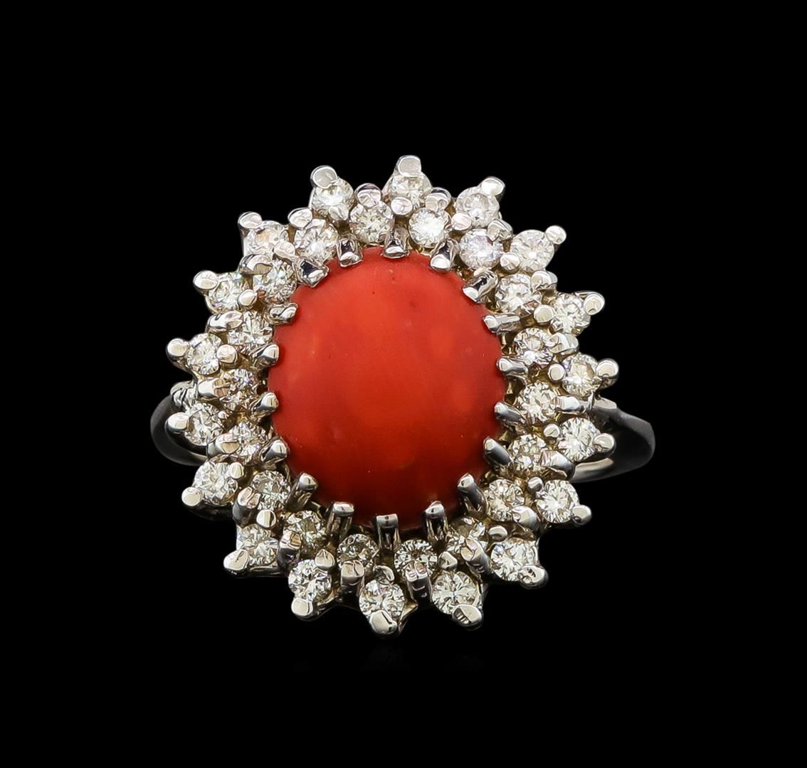 One electronically tested 14KT white gold ladies cast agate and diamond ring with a bright polish finish. Identified with markings of "14K". Condition is new. Containing: One prong set oval cabochon cut natural agate, measuring 10.50 x 8.00. x 0.00.mm, approximate weight of 3.85ct., clarity is heavily included, medium dark, brownish, red color, (GIA R 6/1), cut is good. Thirty-Six prong set round brilliant cut diamonds, measuring 1.60 - 1.60 x 0.96mm (depth est.) approximate total weight of 36 Stones = 0.73ct. Clarity: SI-2 to I-1. Color: H - I, Cut is Good. Colored gemstones are presumed to have been subjected to commonly used enhancement processes. All diamonds and colored gemstones are graded in the mounting, unless otherwise stated. Total Weight of Colored Stones 3.85ct. Total Weight of Diamonds 0.73ct. Total Weight of Ring 7.60 grams. GGL Appraised.