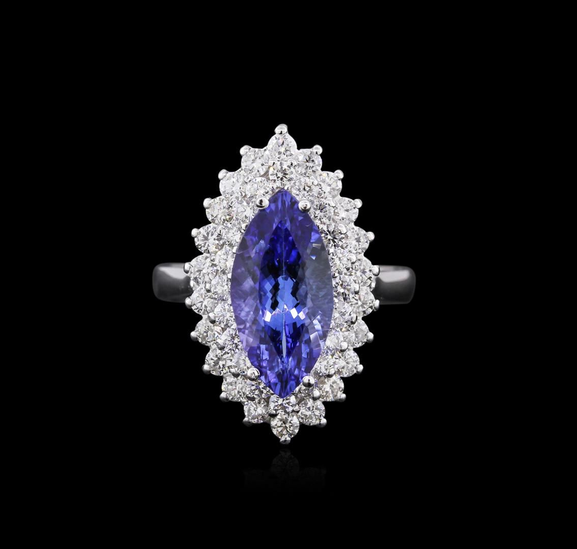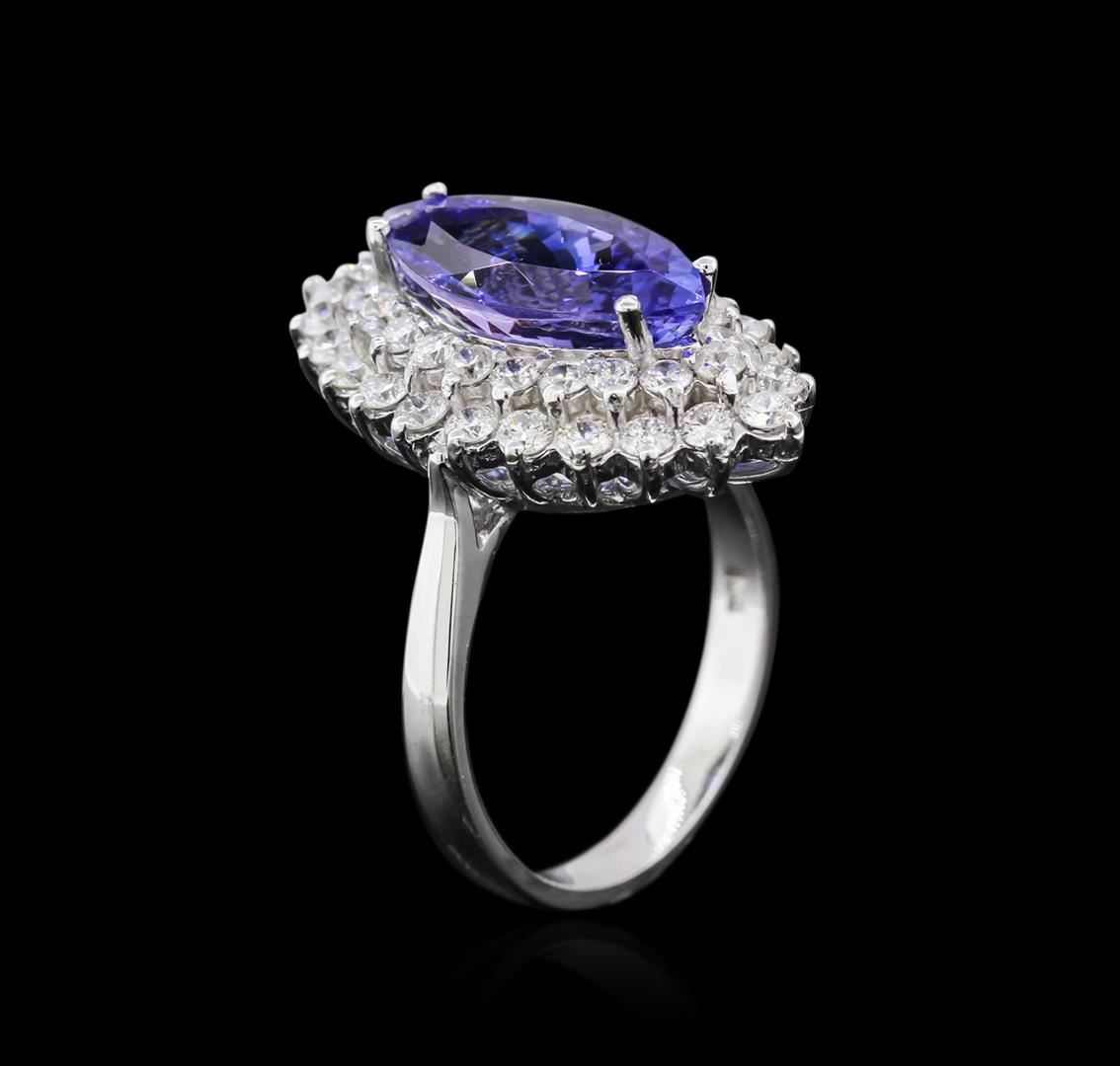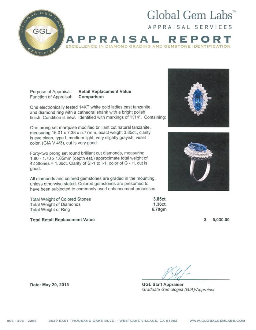 One electronically tested 14KT white gold ladies cast tanzanite and diamond ring with a cathedral shank with a bright polish finish. Identified with markings of "K14". Condition is new. Containing: One prong set marquise modified brilliant cut natural tanzanite, measuring 15.01 x 7.38 x 5.77mm, exact weight 3.85ct., clarity is eye clean, type I, medium light, very slightly grayish, violet color, (GIA V 4/3), cut is very good. Forty-Two prong set round brilliant cut diamonds, measuring 1.80 - 1.70 x 1.05mm (depth est.) approximate total weight of 42 Stones = 1.36ct. Clarity: SI-1 to I-1. Color: G - H, Cut is Good. All diamonds and colored gemstones are graded in the mounting, unless otherwise stated. Colored gemstones are presumed to have been subjected to commonly used enhancement processes. Total Weight of Colored Stones 3.85ct. Total Weight of Diamonds 1.36ct. Total Weight of Ring 6.70 grams. GGL Appraised at $5,030.00.