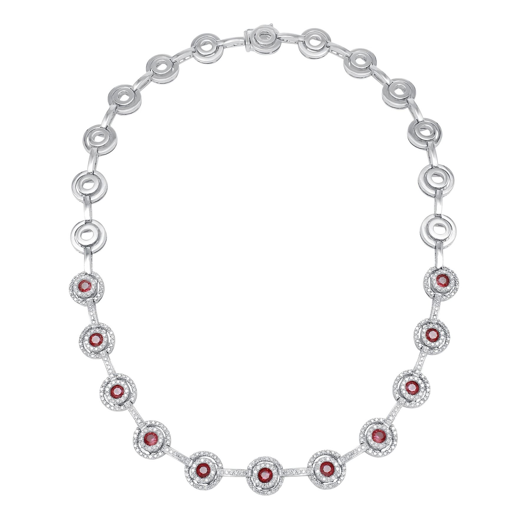One 14KT White Gold 3.85ctw Ruby and Diamond Necklace. (11) Rubies with a total weight of 3.85cts. (401) Diamonds with a total weight of 2.79cts with a color of I and clarity of SI-2. Total weight of this necklace is 55.08 grams.