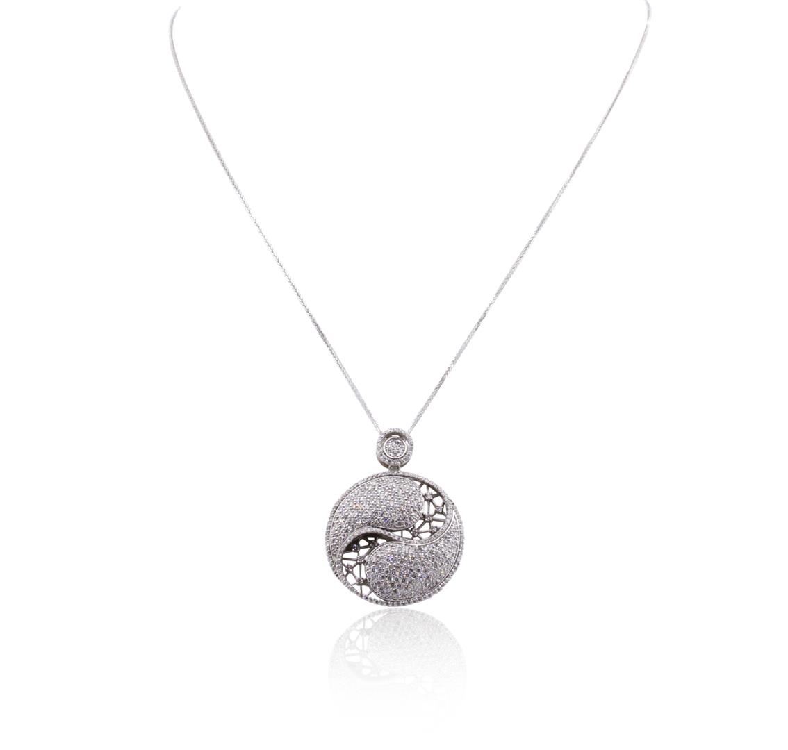 One electronically tested 14KT white gold ladies combination cast & assembled diamond pendant & chain 18.0 long, medium fancy link with a lobster claw clasp with a bright polish finish. Identified with markings of 585. Condition is new. Containing: Five Hundred Forty-Six prong set round brilliant cut diamonds, measuring 1.40 - 1.10 x 0.75mm (depth est.) approximate total weight of 546 Stones = 3.88ct. Clarity: SI-2 to I-1. Color: I - J, Cut is Good. All diamonds are graded in the mounting, unless otherwise stated. Total Weight of Diamonds 3.88ct. Total Weight of Pendant & Chain 15.00 grams. GGL Appraised.