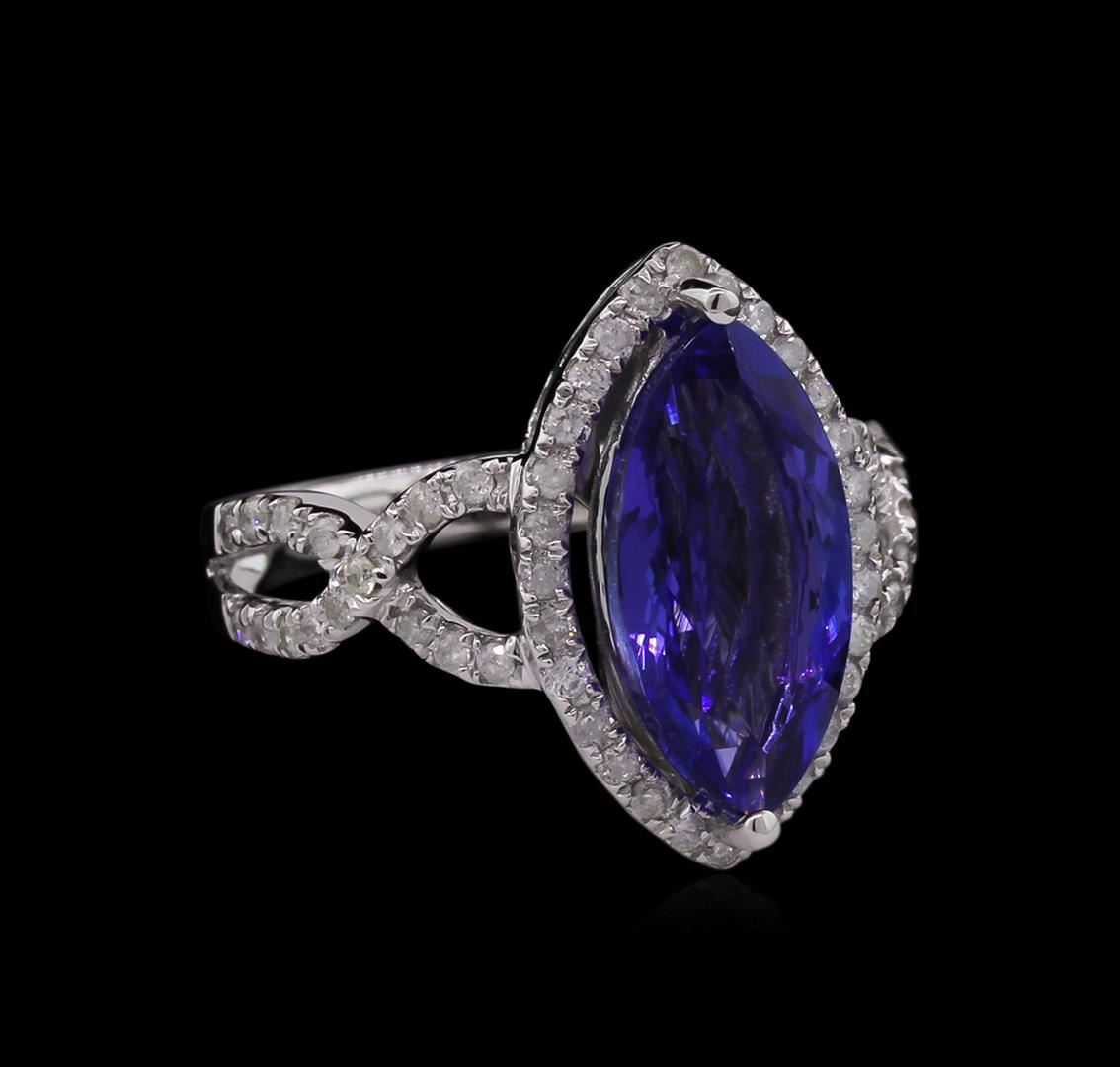 One electronically tested 14KT white gold Ladies cast ring with a bright polish finish. Condition is new. Identified with markings of "14K". Containing: One prong set marquise modified brilliant cut natural tanzanite, measuring 15.00 x 7.90 x 5.14mm, approximate weight of 3.88ct., clarity is eye clean, type I, medium, moderately strong, violet color, (GIA V 5/4), cut is good. Colored gemstones are presumed to have been subjected to commonly used color/clarity enhancement processes. Fifty-Nine prong set round brilliant cut diamonds, measuring 1.30 - 1.30 x 0.78mm (depth est.) approximate. Total Weight of 59 Stones = 0.47ct. Clarity: I-1 to I-3. Color: I - J, Cut is Good. All grading of diamonds and colored gemstones in this piece of jewelry are graded in the mounting, unless otherwise stated. Total Weight of Colored Stones 3.88ct. Total Weight of Diamonds 0.47ct. Total Weight of Ring 6.30 grams. GGL Appraised at $8,480.00.