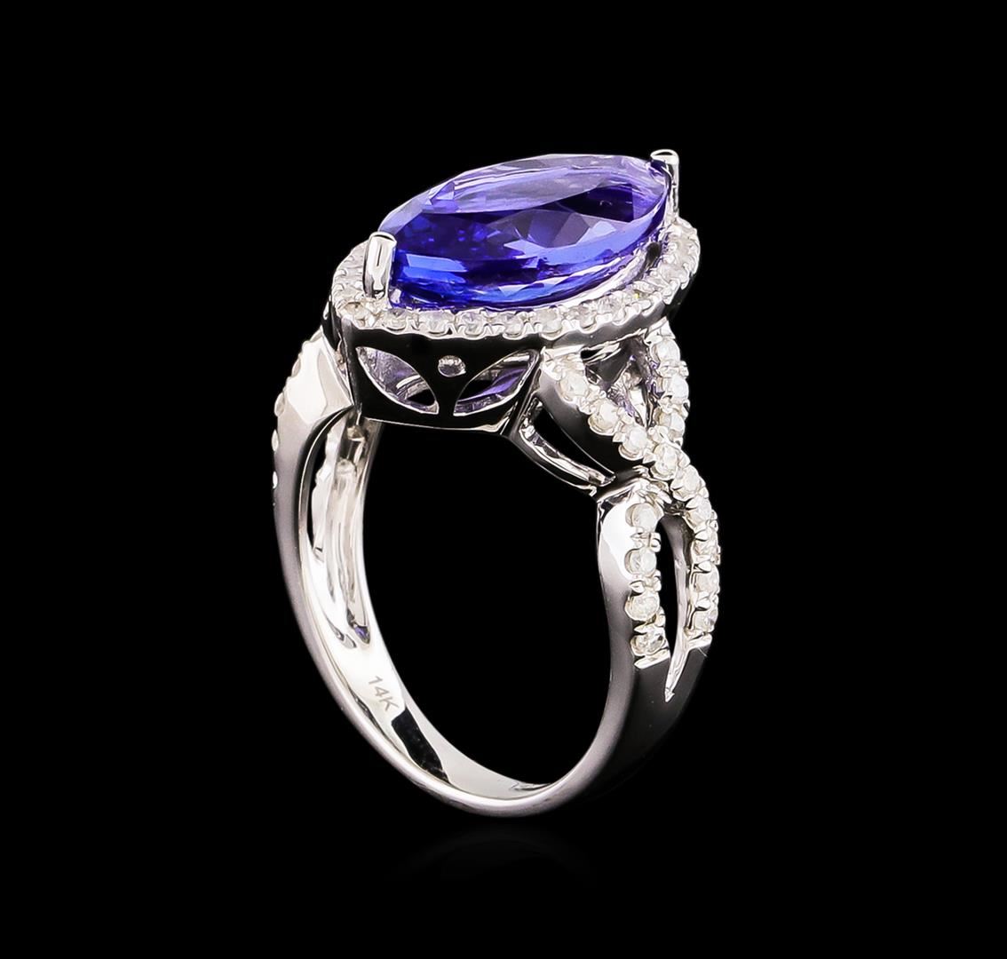 One electronically tested 14KT white gold Ladies cast ring with a bright polish finish. Condition is new. Identified with markings of "14K". Containing: One prong set marquise modified brilliant cut natural tanzanite, measuring 15.00 x 7.90 x 5.14mm, approximate weight of 3.88ct., clarity is eye clean, type I, medium, moderately strong, violet color, (GIA V 5/4), cut is good. Colored gemstones are presumed to have been subjected to commonly used color/clarity enhancement processes. Fifty-Nine prong set round brilliant cut diamonds, measuring 1.30 - 1.30 x 0.78mm (depth est.) approximate. Total Weight of 59 Stones = 0.47ct. Clarity: I-1 to I-3. Color: I - J, Cut is Good. All grading of diamonds and colored gemstones in this piece of jewelry are graded in the mounting, unless otherwise stated. Total Weight of Colored Stones 3.88ct. Total Weight of Diamonds 0.47ct. Total Weight of Ring 6.30 grams. GGL Appraised at $8,480.00.