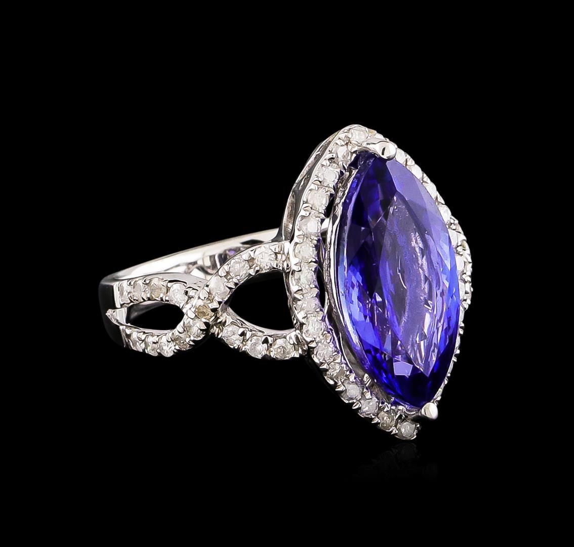 One electronically tested 14KT white gold Ladies cast ring with a bright polish finish. Condition is new. Identified with markings of "14K". Containing: One prong set marquise modified brilliant cut natural tanzanite, measuring 15.00 x 7.90 x 5.14mm, approximate weight of 3.88ct., clarity is eye clean, type I, medium, moderately strong, violet color, (GIA V 5/4), cut is good. Colored gemstones are presumed to have been subjected to commonly used color/clarity enhancement processes. Fifty-Nine prong set round brilliant cut diamonds, measuring 1.30 - 1.30 x 0.78mm (depth est.) approximate. Total Weight of 59 Stones = 0.47ct. Clarity: I-1 to I-3. Color: I - J, Cut is Good. All grading of diamonds and colored gemstones in this piece of jewelry are graded in the mounting, unless otherwise stated. Total Weight of Colored Stones 3.88ct. Total Weight of Diamonds 0.47ct. Total Weight of Ring 6.30 grams. GGL Appraised at $8,480.00.